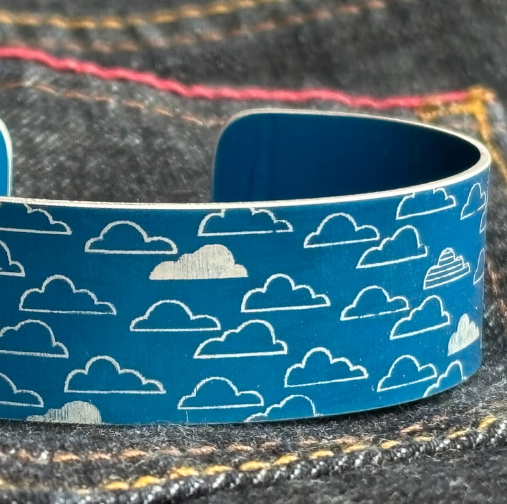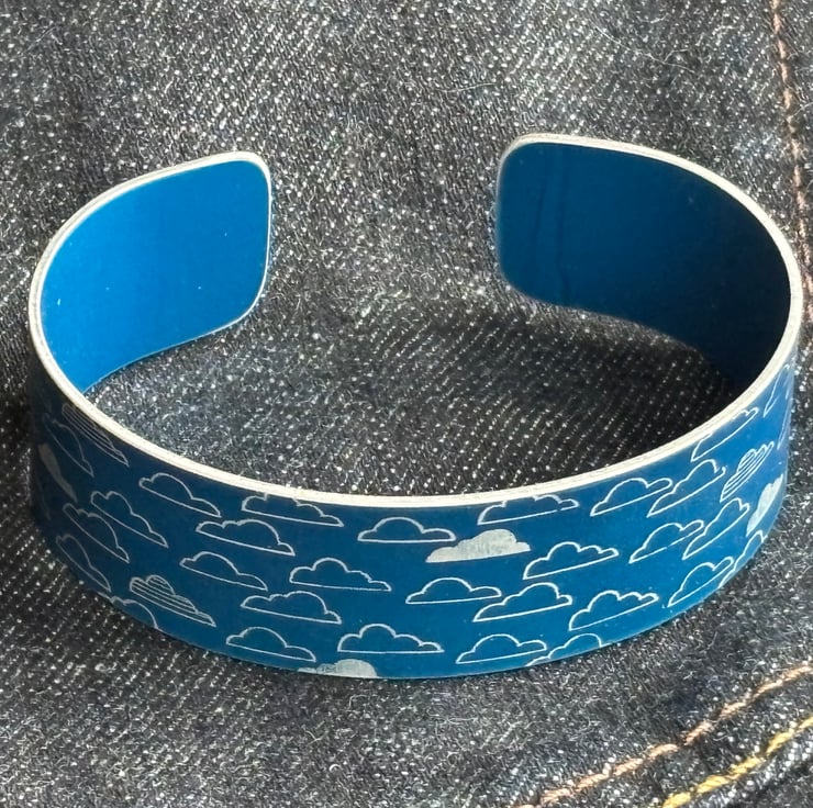 A stylish bracelet/narrow cuff made from anodised aluminium with a mini print of clouds. I drew this pattern digitally, made it into a resist and applied it to the metal. I then dye the aluminium, seal it and remove the resist which leaves the pattern showing in the original colour of the metal. The cuff is then made using traditional metalworking techniques.