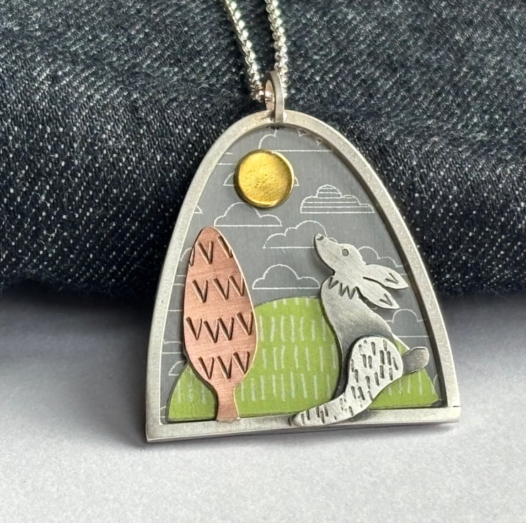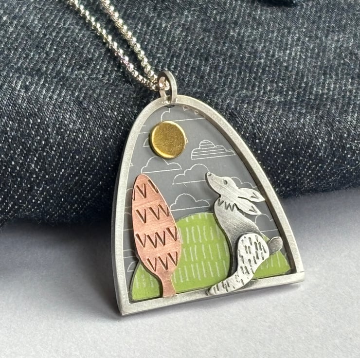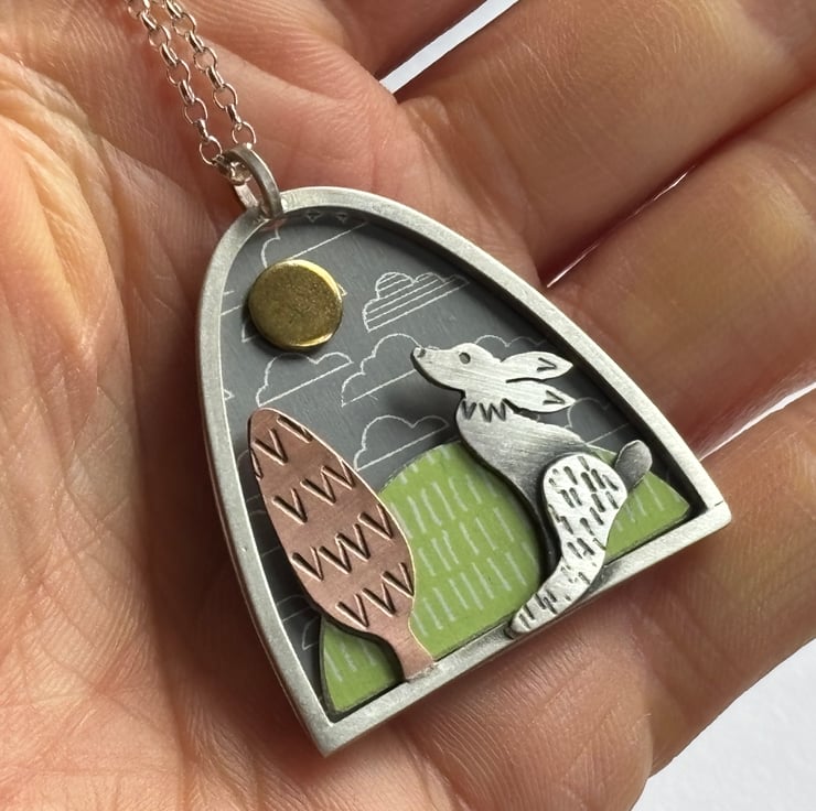 Love hares? Then this necklace is for you. It features a hand cut silver hare gazing up at a golden sunshine. There is a copper tree in the scene and these elements have been textured, oxidised and polished back to give a satin finish.`This scene is framed by a sterling silver arch and has a grey cloud patterned background and a green hill which has been hand crafted from anodised aluminium. Hung from an 18 inch sterling silver chain (please ask if you'd like a different length).