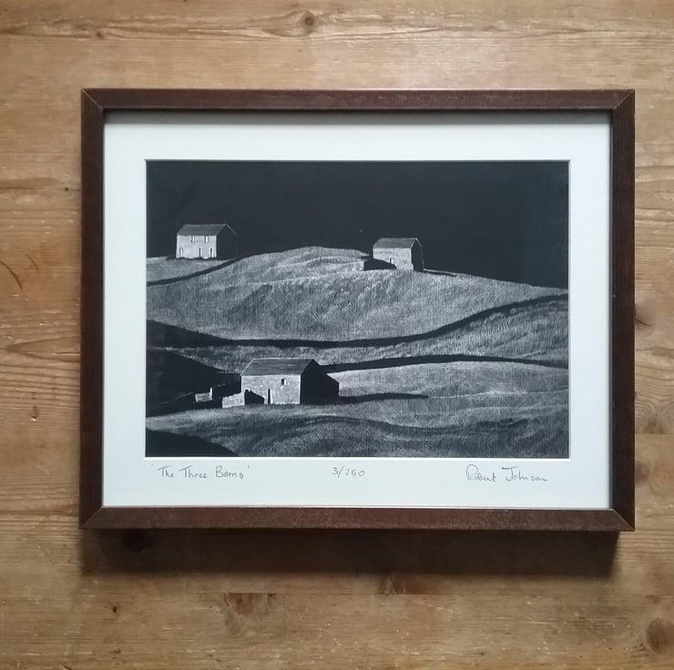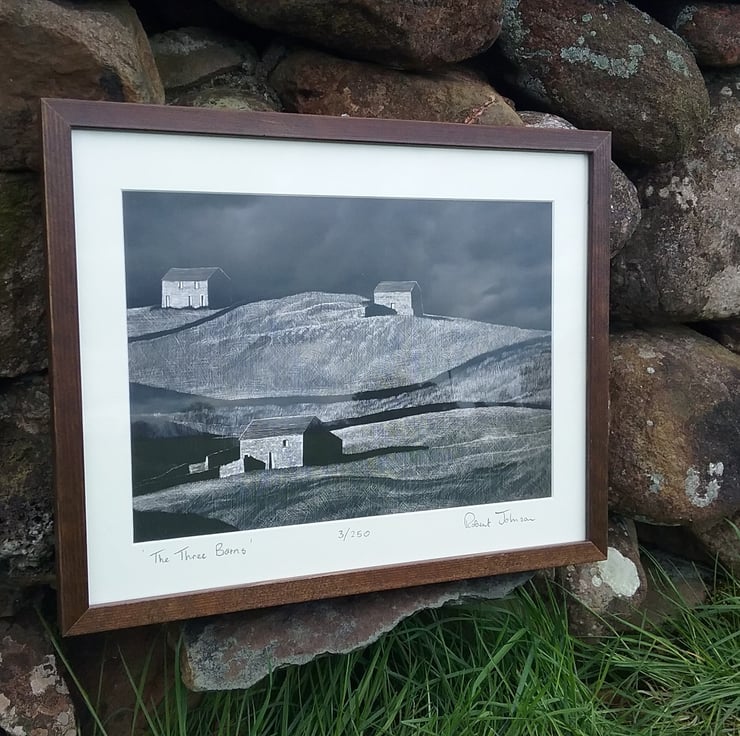 This is a high quality fine art print on Hemp paper printed with eco-friendly inks. It depicts an original piece of artwork executed on Scraper Board. The process of making the original is like drawing in reverse! Instead of making black marks on white paper, each mark takes off the outer layer of black ink to reveal the white China clay below. The piece depicts a scene from my beloved Yorkshire Dales in which I live and work.