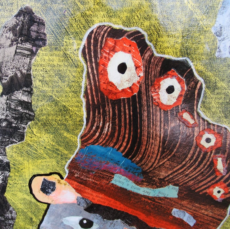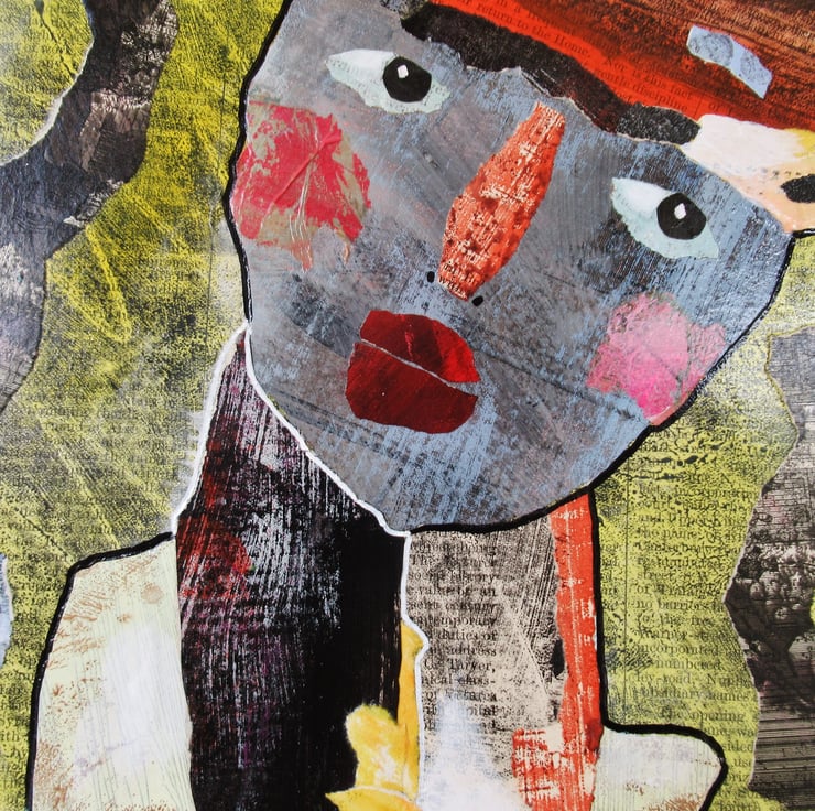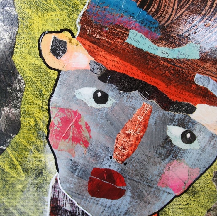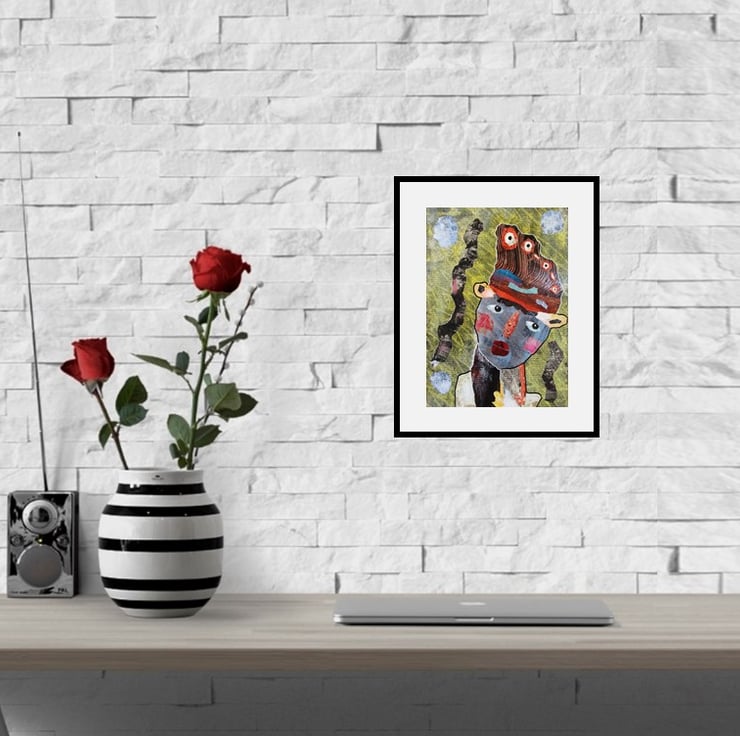 Unusual and attractive mixed media portrait painting in collage on board created using my own painted papers. This quirky original artwork measures 8.25 x 11.75 inches (UK size A4) so perfect to pop straight into any standard A4 size frame (or mat.) It will be signed on the front by Beatrice before shipping and it is unframed with a soft sheen surface finish. (Framed photos are for illustration purposes only.)