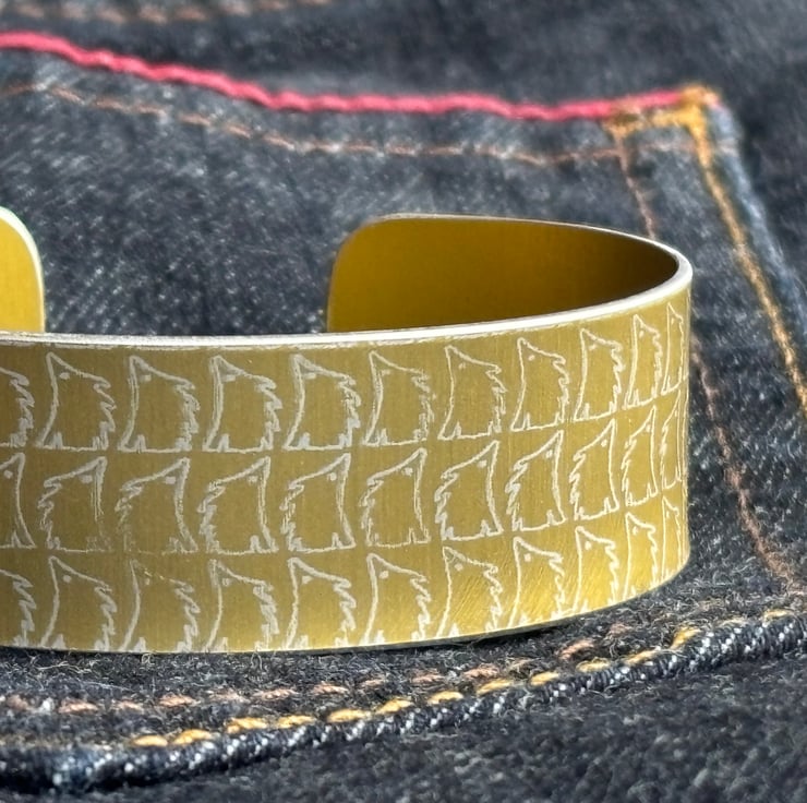 A cute bracelet/narrow cuff made from anodised aluminium with a mini print of hedgehogs. I drew this pattern digitally, made it into a resist and applied it to the metal. I then dye the aluminium, seal it and remove the resist which leaves the pattern showing in the original colour of the metal. The cuff is then made using traditional metalworking techniques.