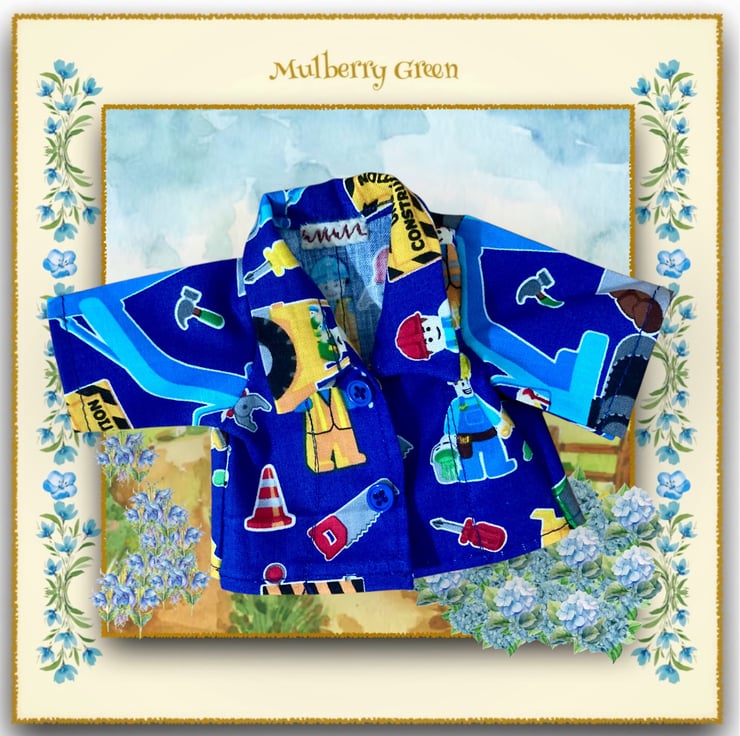 A cute little shirt to fit the Mulberry Green characters. The shirt is made from best quality cotton in a construction workers print. It fastens with poppers underneath the buttons and looks lovely with the cords or jeans.