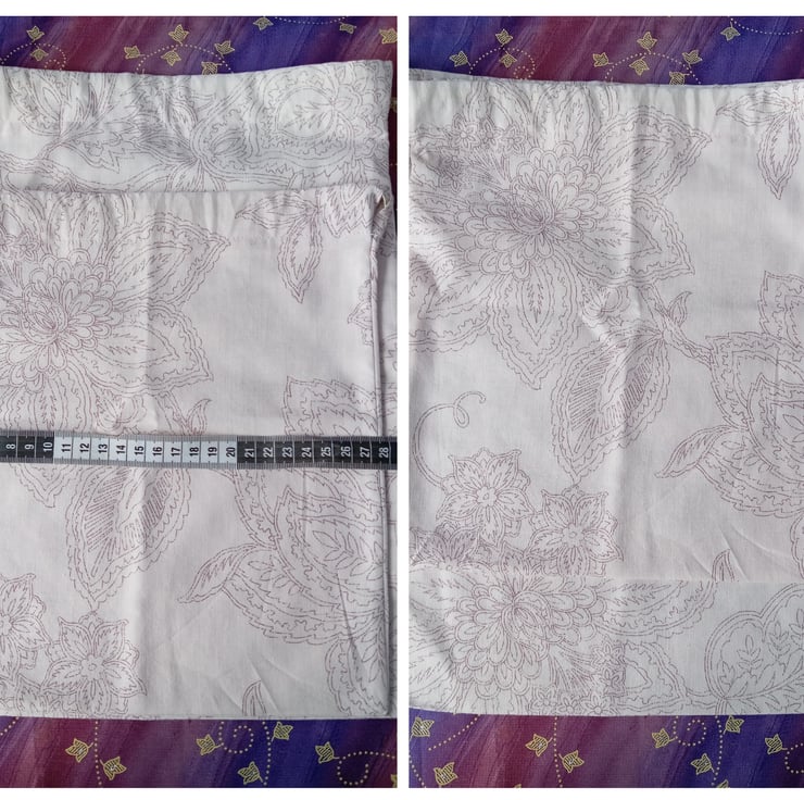 The fabric is a polycotton and was previously curtain lining. It's a dark cream with a reddish brown floral print.