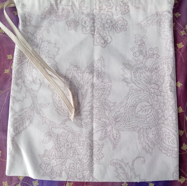 The fabric is a polycotton and was previously curtain lining. It's a dark cream with a reddish brown floral print.