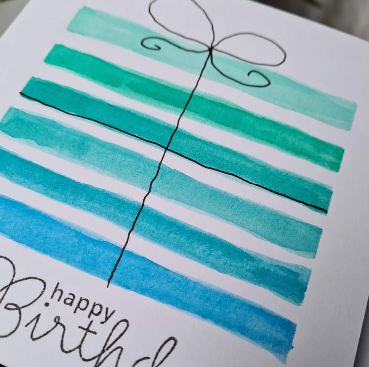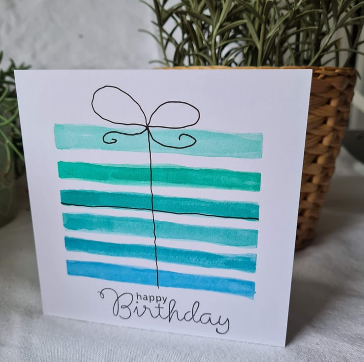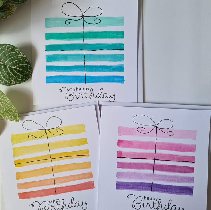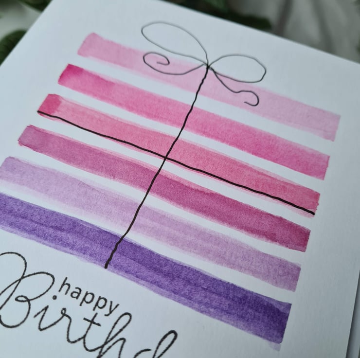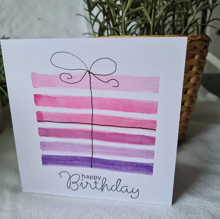 This is a pretty gift style birthday card handpainted in watercolour with fineliner pen detail on quality card, available in three colourways. Also available as a numbered card, see 'numbered birthday cards' collection. There is also a similar rainbow striped birthday card available.