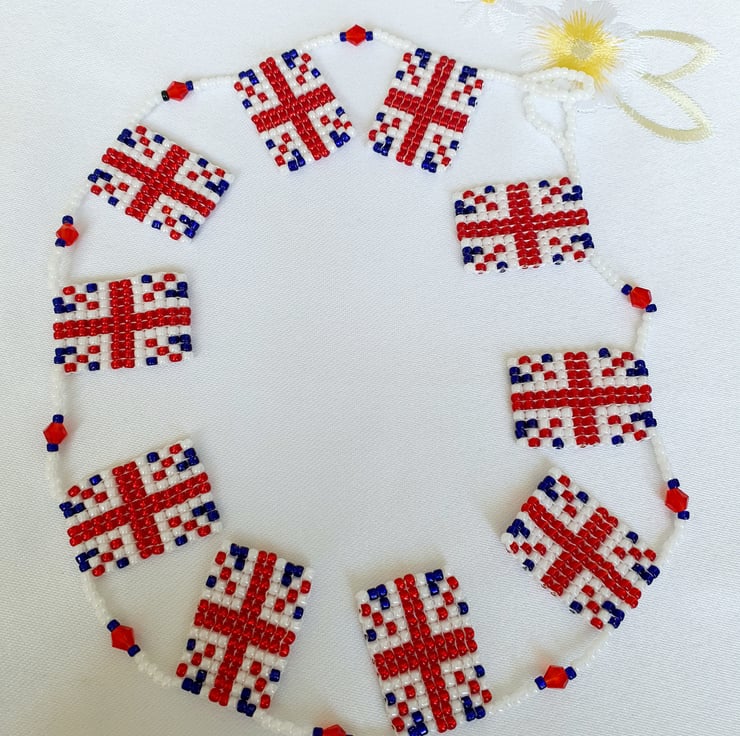 Handmade, Handwoven Beaded Bunting. Union Jack, United Kingdom, Great Britian Flags