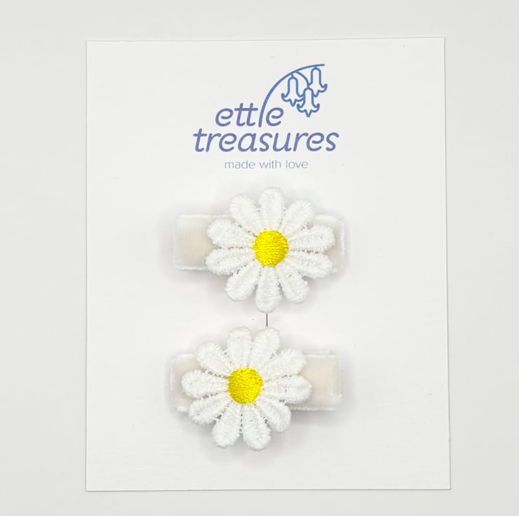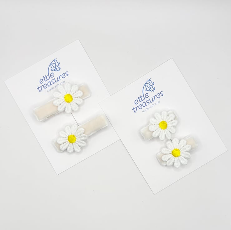 Handmade Baby size White velvet ribbon fully lined alligator hair clips with cotton sewn daisy flowers.