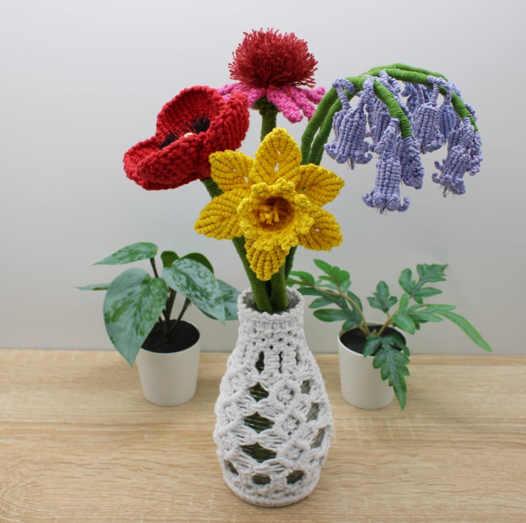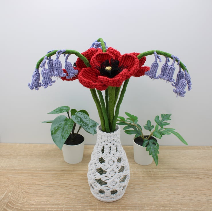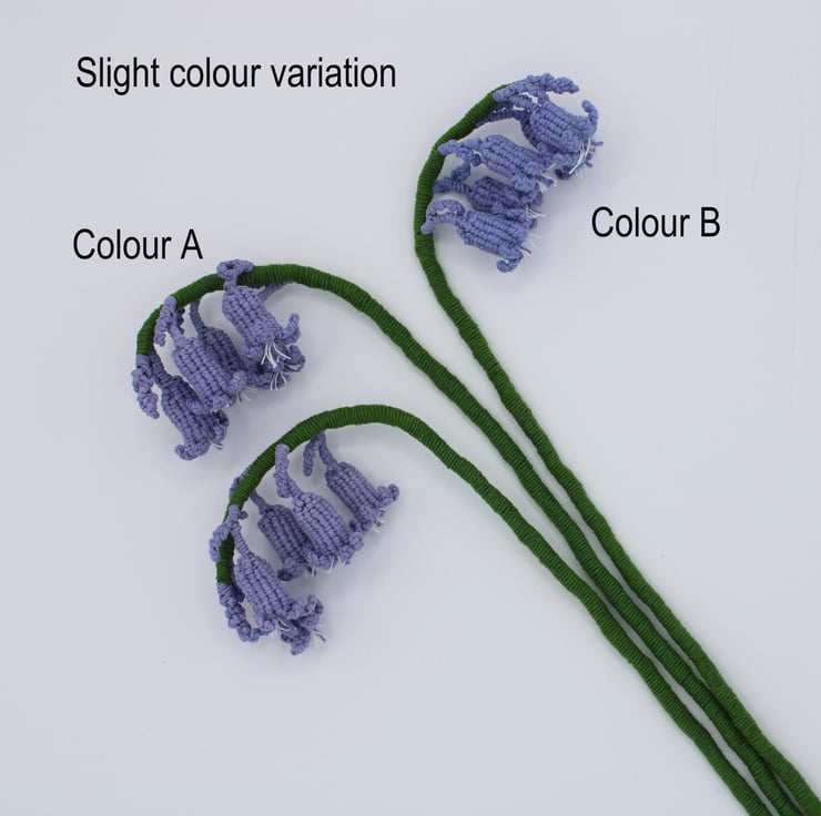 The macrame bluebells have been knotted by hand using my own design and make a stunning display on their own or in an arrangement to compliment other flowers. I have used polished hemp and 100% cotton bakers twine to make my bells. As each one is hand crafted they will differ slightly. Slight colour variations can add depth to an arrangement and where a colour difference is a little more noticeable I will add a variation for you to choose.
