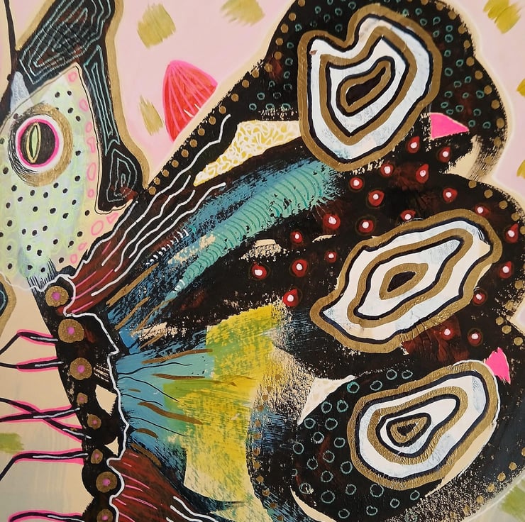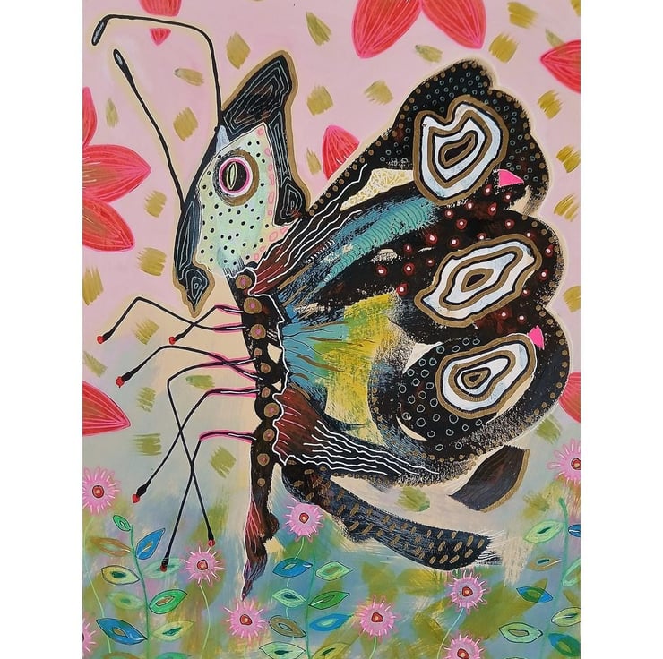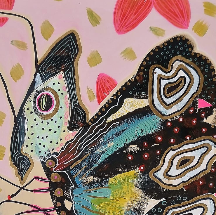 Attractive mixed media insect painting in acrylic and drawing pens on 9 x 12 inch light card. Ideal to pop straight into any standard sized 9 x 12 inch frame (or mount). Quirky and slightly surreal butterfly painting in gorgeous pastel tones with black detailing which will be discreetly signed by Bea before shipping.