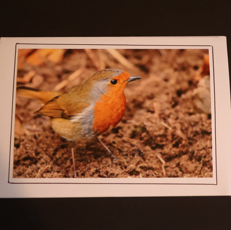 A professionally printed 6 x 4 inch approx. card of a Robin helping in the garden, on a mounted 7 x 5 inch approx. plain white card, with a blank inner. left plain for you to add your own personal message. An envelope is included.