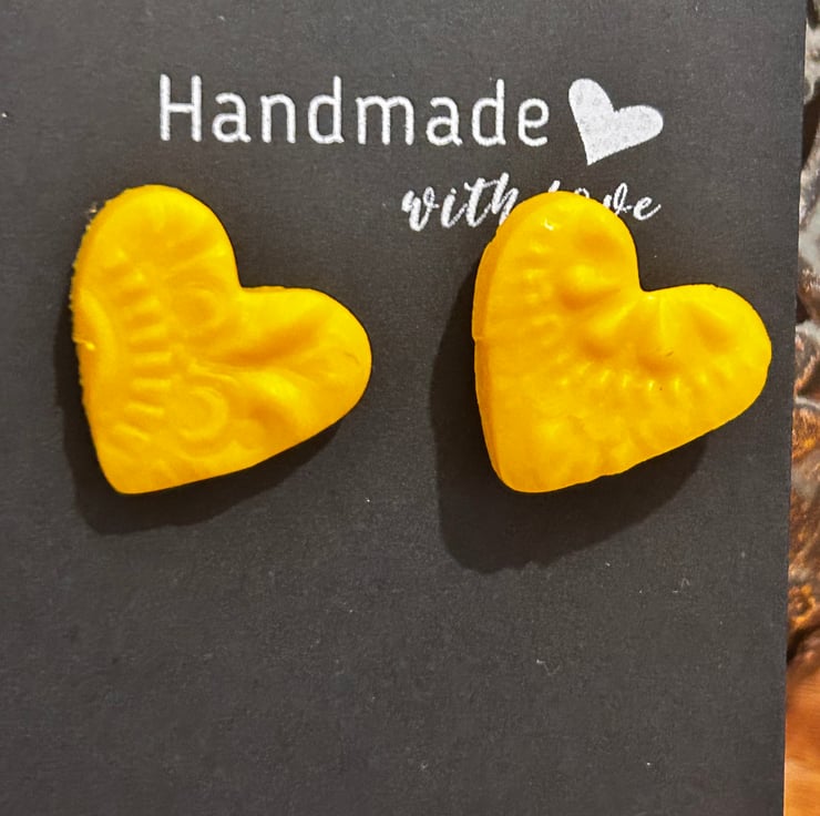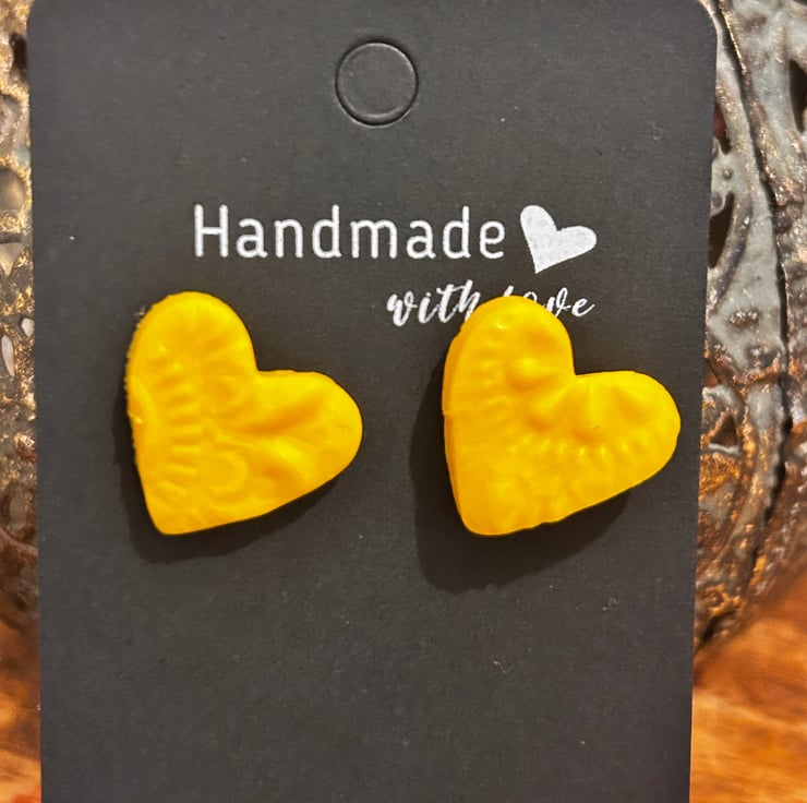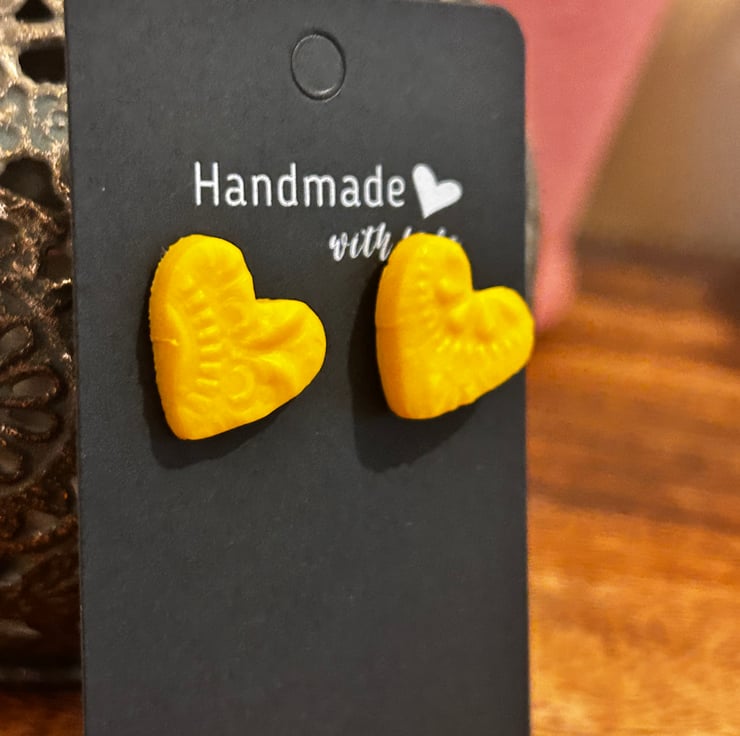 Here I made some heart shaped polymer clay stud earrings. Very pretty Mandala pattern on the face of the earrings. Attached with a stainless steel ear hook.