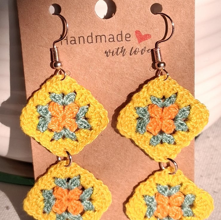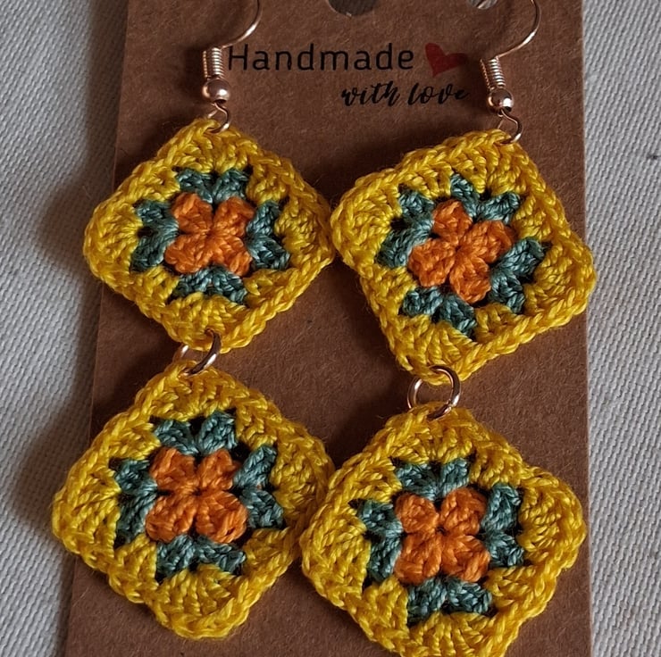 Granny style crochet earrings made in crochet cotton. Earring clasp is a rose gold plated, nickle free copper base metal and joined together with a rose gold ring.