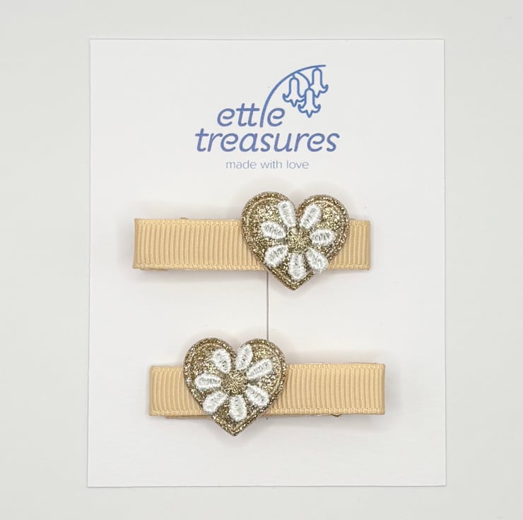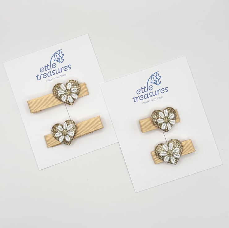 Handmade Gold sparkle heart embellishment with a white and gold cotton flower, set on fully lined ribbon alligator hair clips