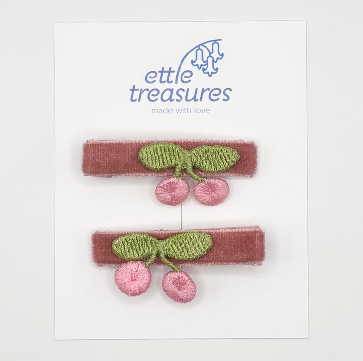 Handmade Vintage Rose pink pink velvet fully lined alligator hair clips with cotton sewn pink cherries perfect summer vibe.