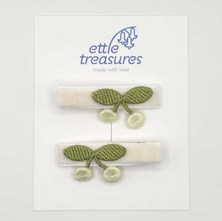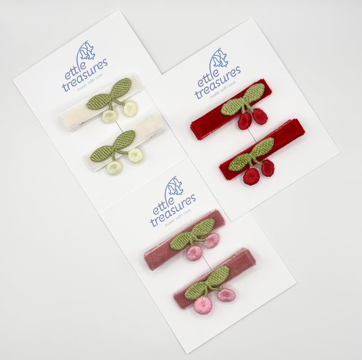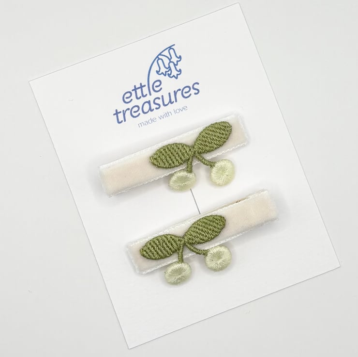 Handmade White velvet fully lined alligator hair clips with cotton sewn milky white cherries, perfect summer vibe.