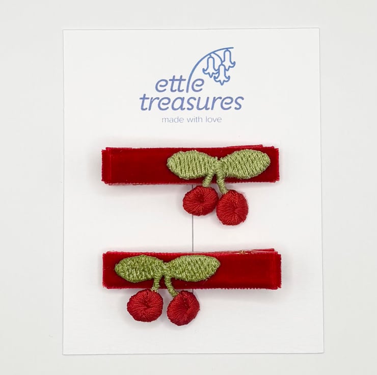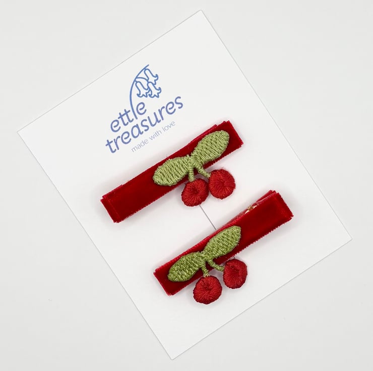 Handmade Red velvet fully lined alligator hair clips with cotton sewn Red cherries, perfect summer vibe.
