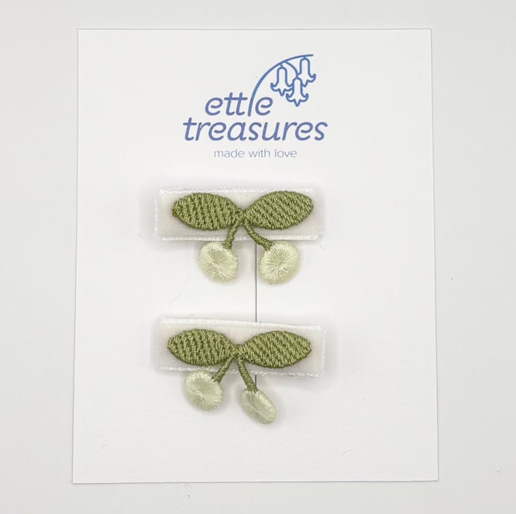 Handmade Baby size White velvet fully lined alligator hair clips with cotton sewn milky white cherries, perfect summer vibe.