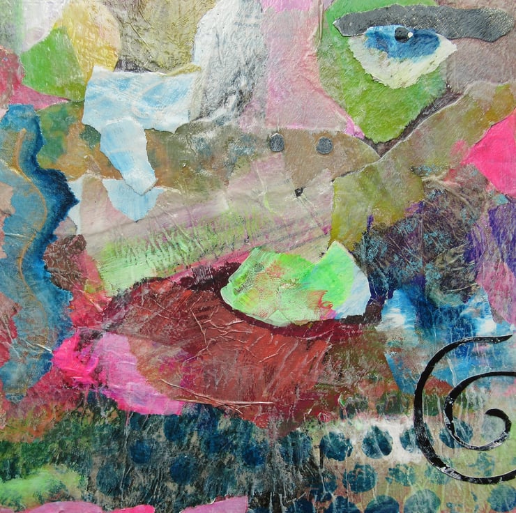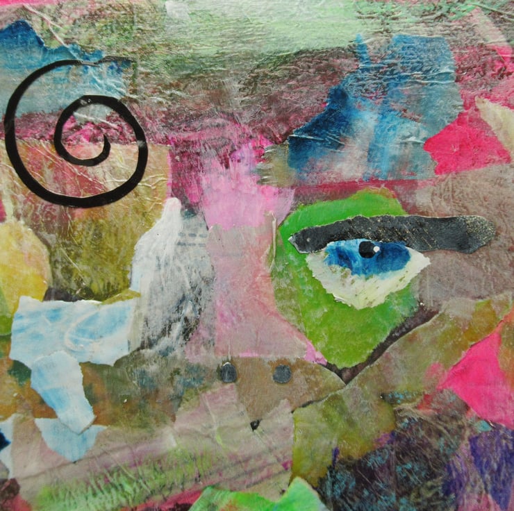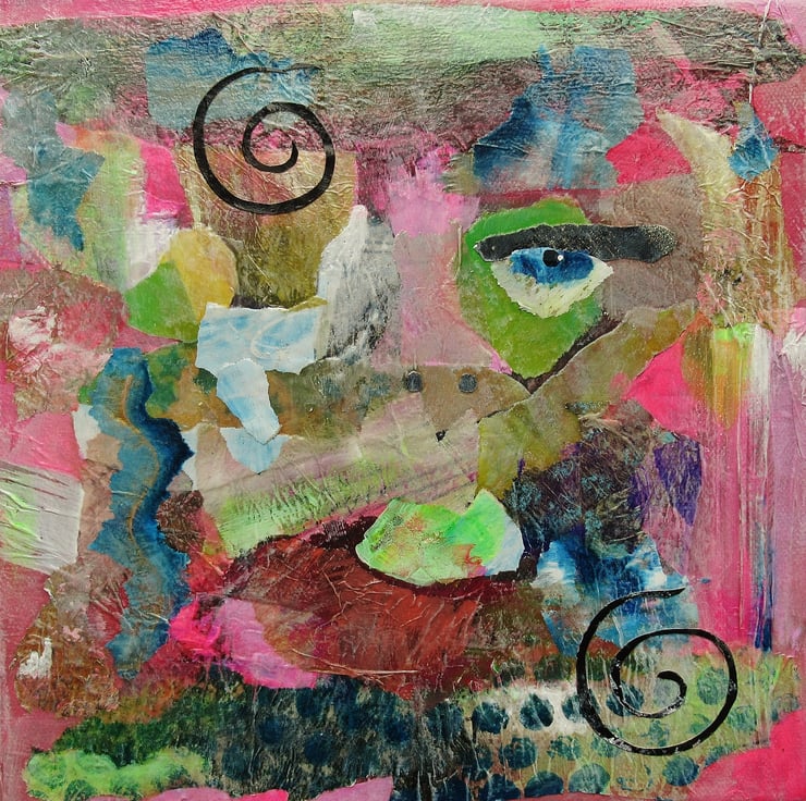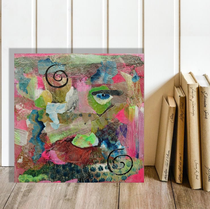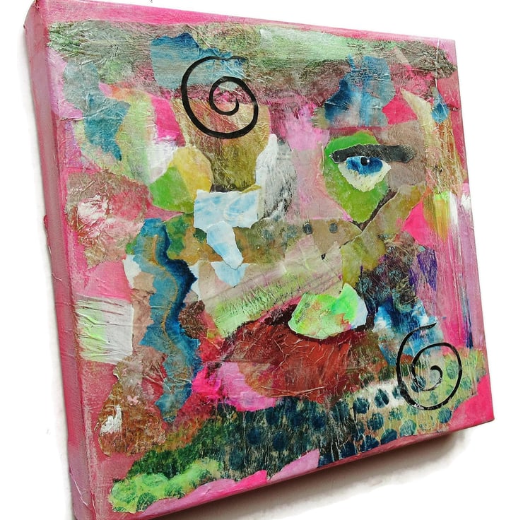 Colourful portrait / face painting in acrylic and collage on 8 x 8 inch deep edge canvas. The edges are painted in with the composition so no framing is necessarily required - just unpack and hang straight on the wall. A small format, wow factor piece of art which will fit beautifully on a small wall or bijoux interior. It is signed up the edge by Beatrice and has a soft sheen surface finish.