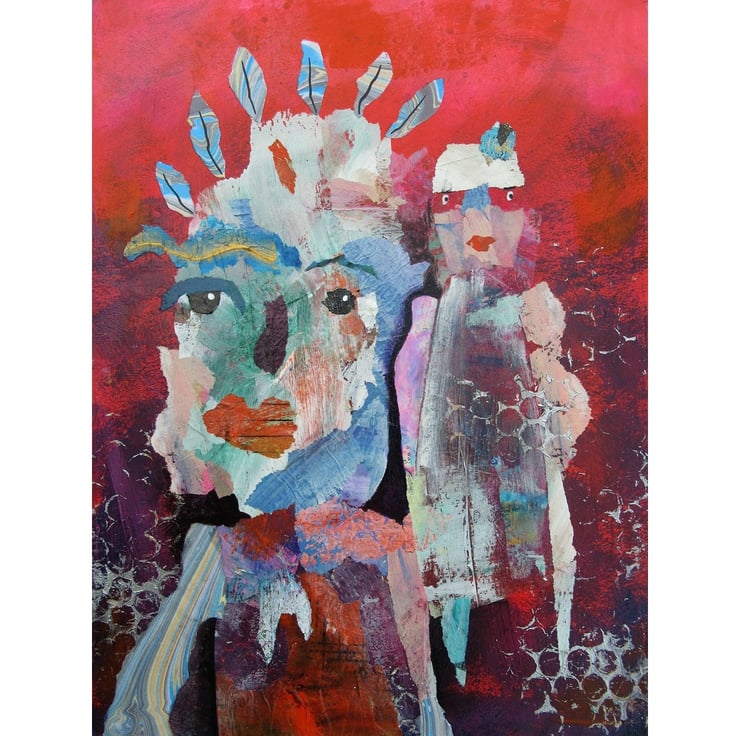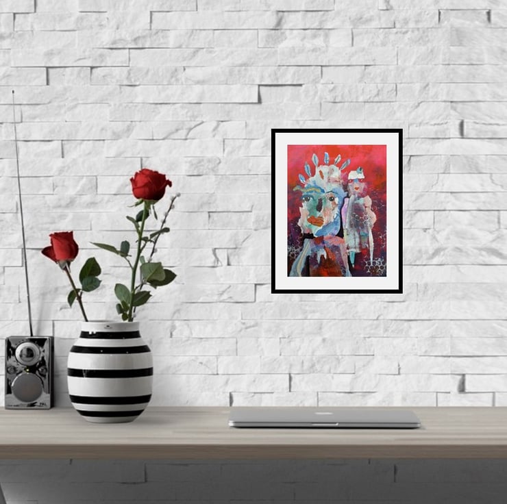 Bold colour abstract figurative painting in acrylic & collage on 9 x 12 inch board. Quirky, slightly surreal people painting which has a soft sheen surface finish. This artwork comes to you unframed and would look make a statement in nay interior. (Framed photos are for illustrative purposes only.)