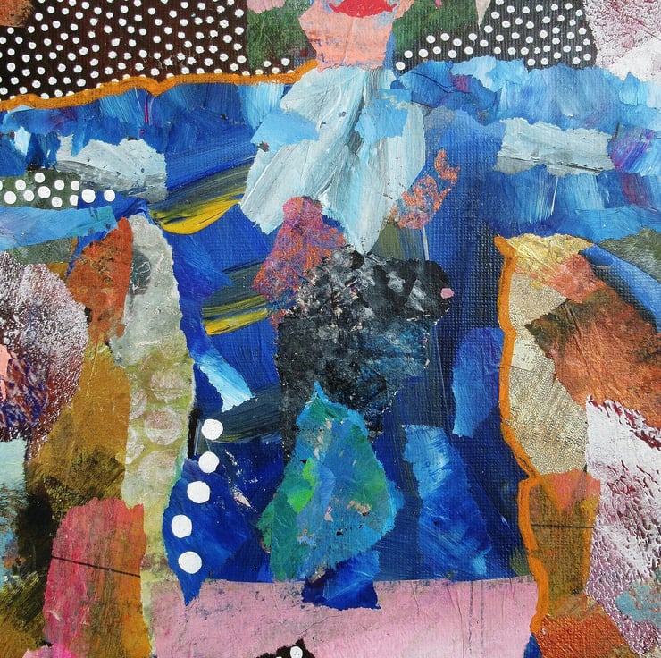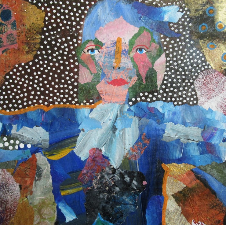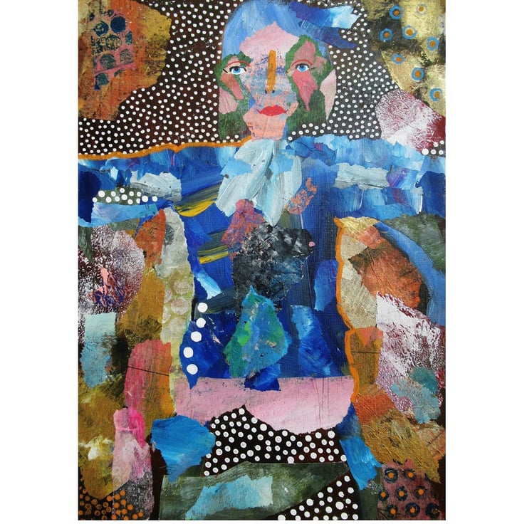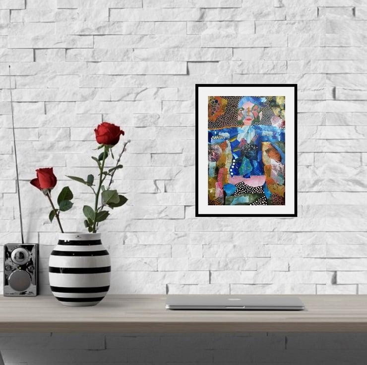 Richly toned abstract figurative artwork in acrylic & collage on A4 sized (8.25 x 11.75 inch) heavy paper, adhered to 2mm board. Quirky, slightly surreal person with a soft sheen surface finish. It will be signed on the front by beatrice before shipping and comes to you unframed. (Framed photos are for illustrative purposes only.)
