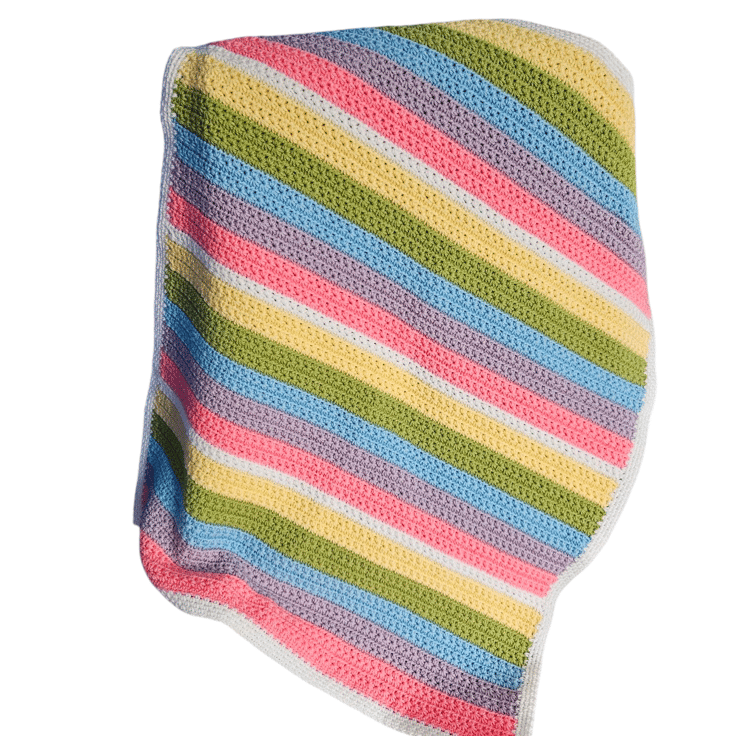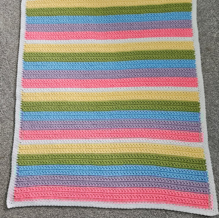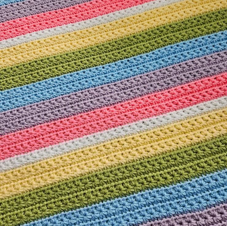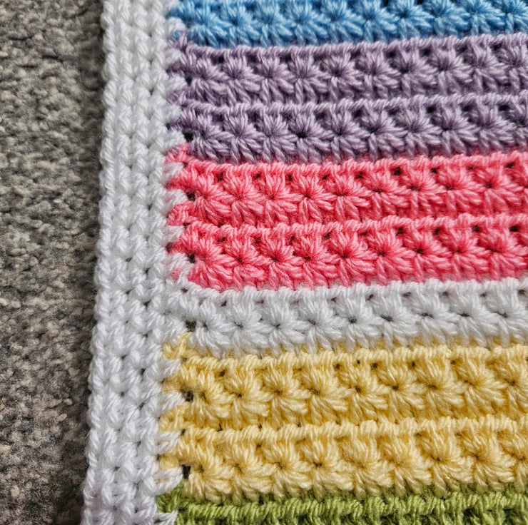This baby blanket has been crafted using the elegant star stitch adding a touch of charm. It has been made with premium acrylic yarn, making it machine washable for convenience. Measuring approximately 33x28 inches (84x71 centimetres), this blanket is versatile and suitable for various uses.