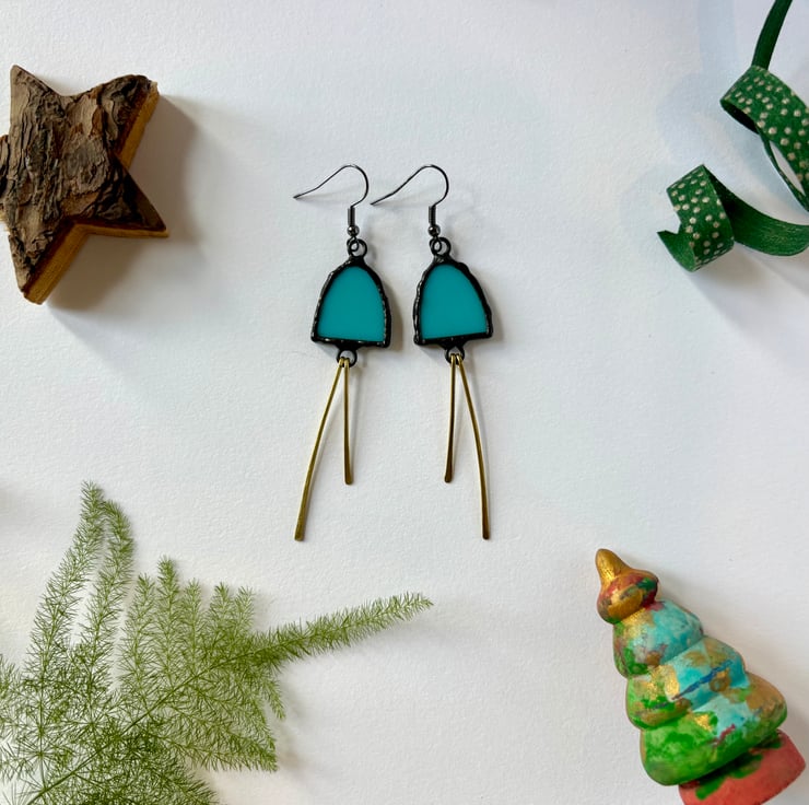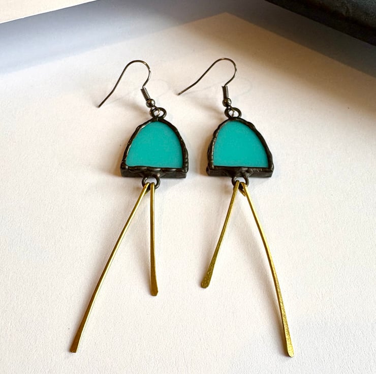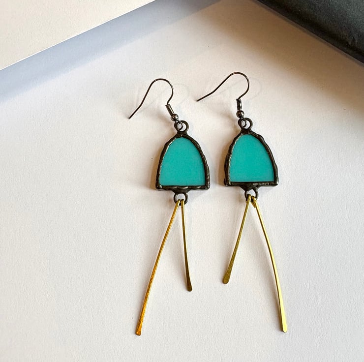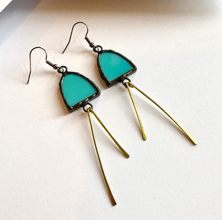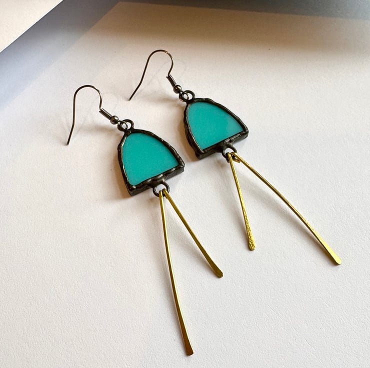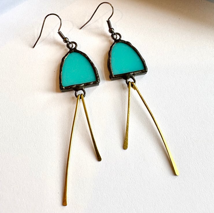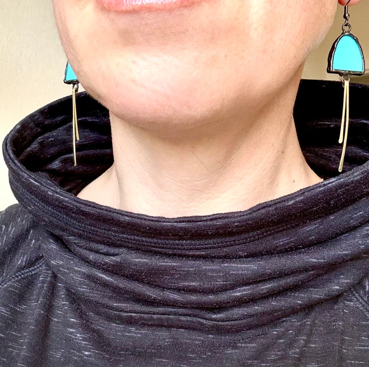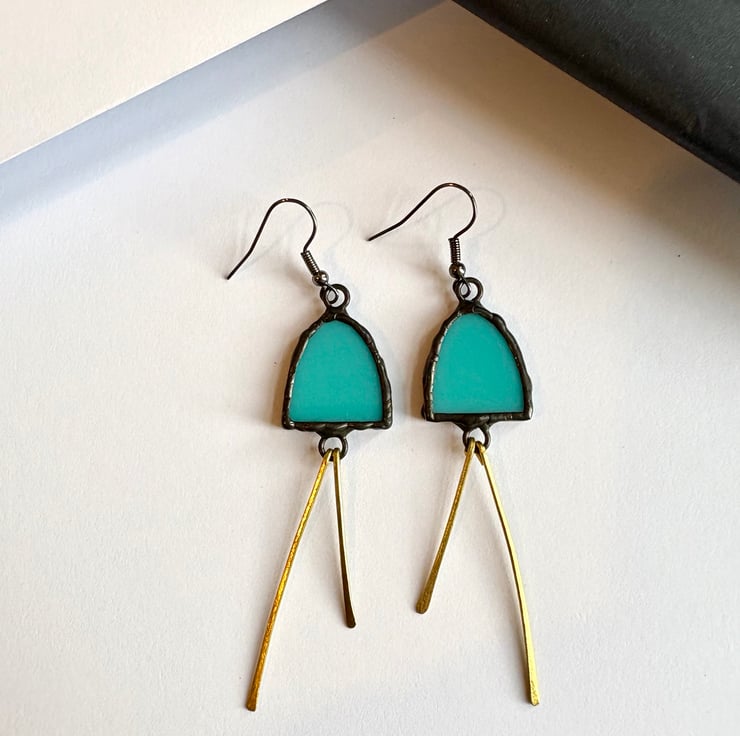 This pair of earrings is a gorgeous statement jewellery piece without added heavy weight. They are lightweight and handmade from marine blue stained glass and hammered brass accents. I design and make all of my work in Dunblane, Scotland where I live. This pair is my most days go to pair of earrings as they are so comfortable to wear but they also make an impact. The colour is a gorgeous shade of marine blue. These earrings can be worn both everyday as well as for a special occasion. The hammered brass accents add extra flow and movement to these earrings.