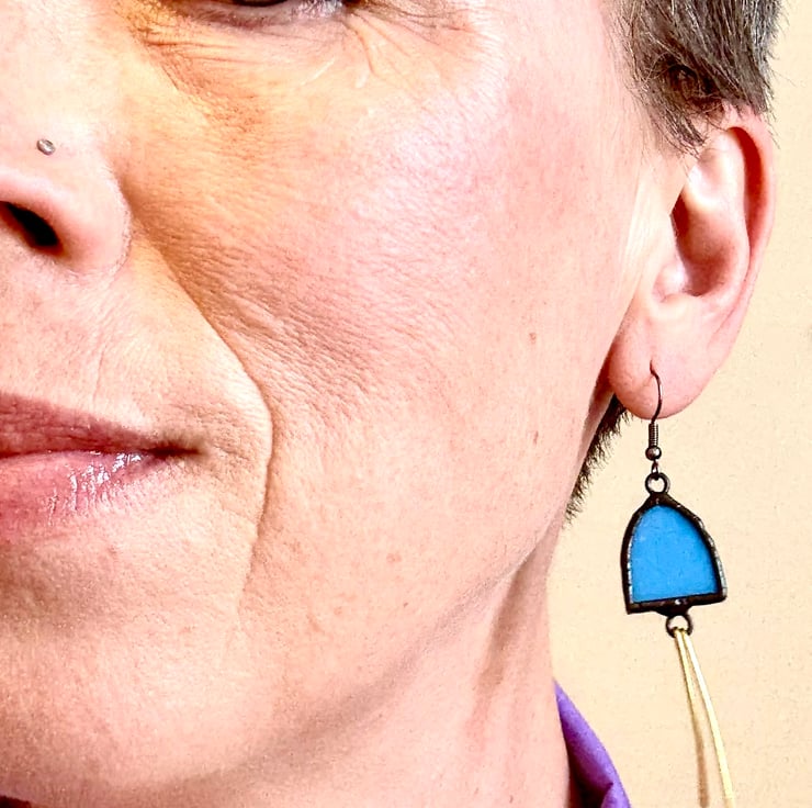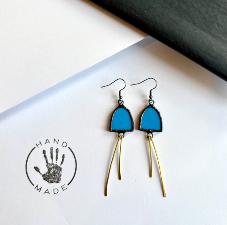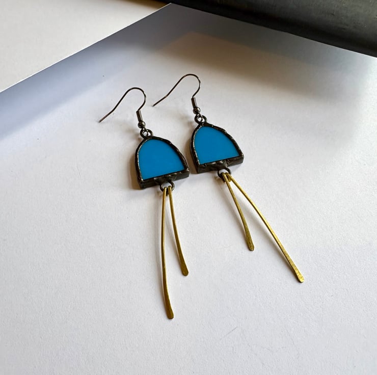 Statement Jewellery, long blue eye-catching stained glass and brass earrings
