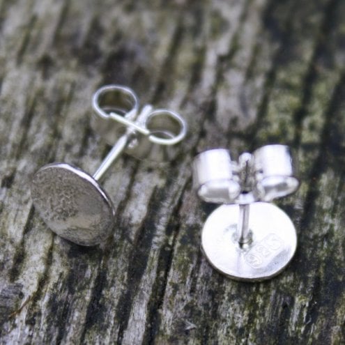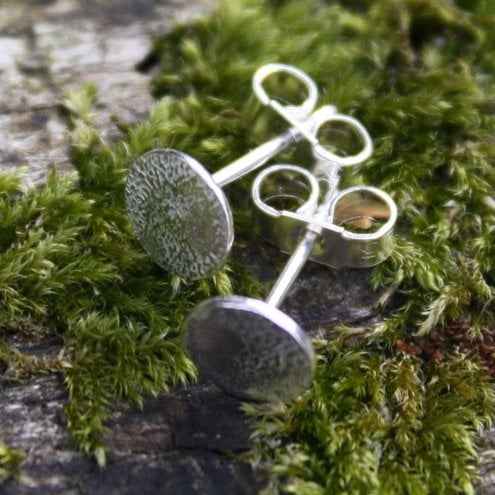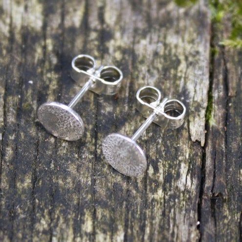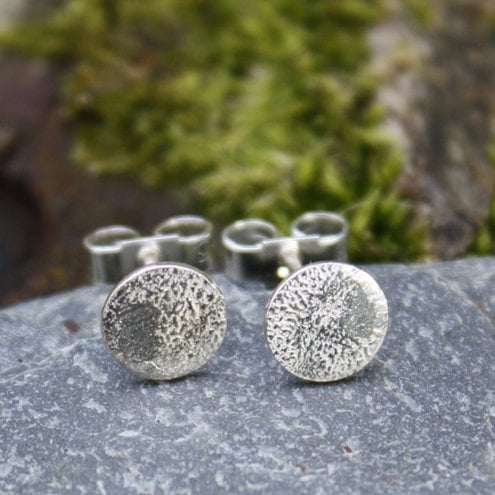 Tiny circular heat textured (reticulated) sterling silver stud earrings.