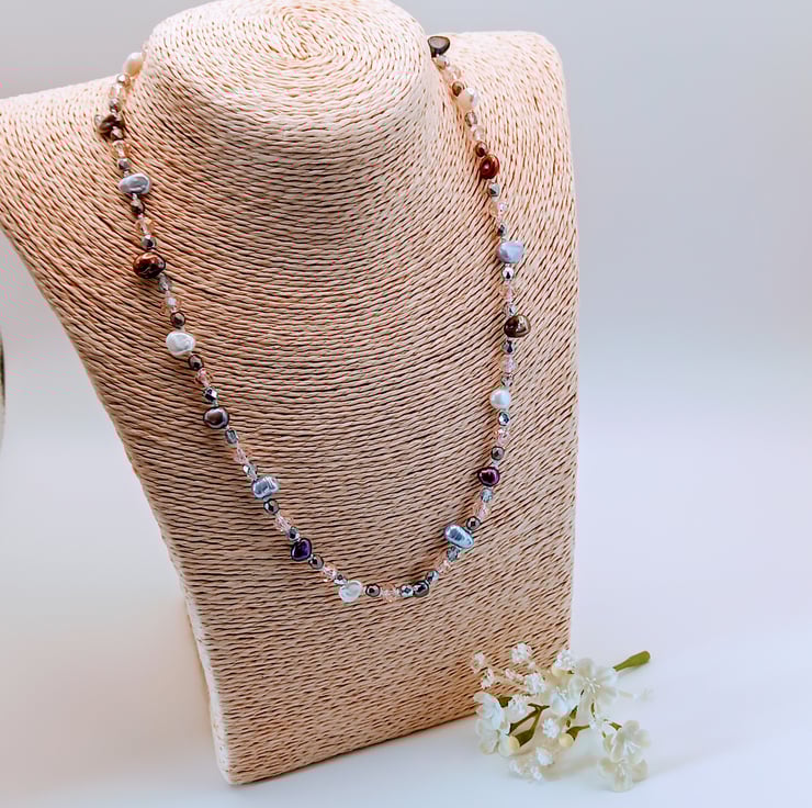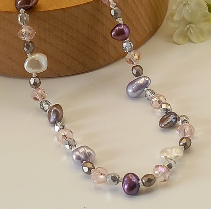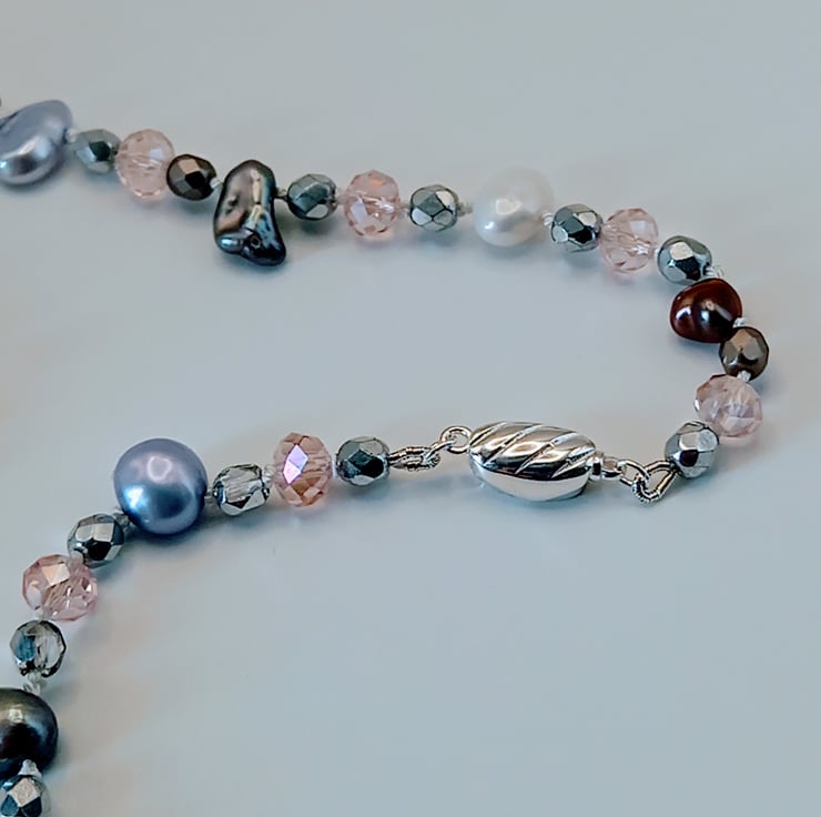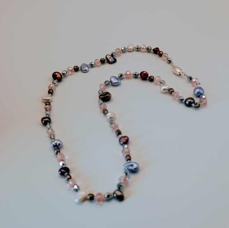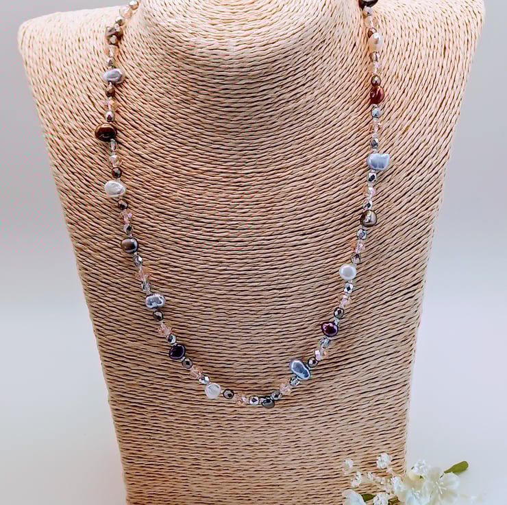A beautiful mix of mainly pastel coloured Keishi pearls, which are irregular shapes giving this necklace a modern and informal feel. The pearls are accompanied by firepolished beads in silvery shades and light pink crystal rondelles. The beads and pearls are joined together using traditional pearl knotting technique with silk thread. The ends are strengthened with french wire (gimp) and the necklace fastens with a sterling silver bean shaped clasp. Each pearl is approximately 7mm long and the necklace measures 19.5 inches in length.