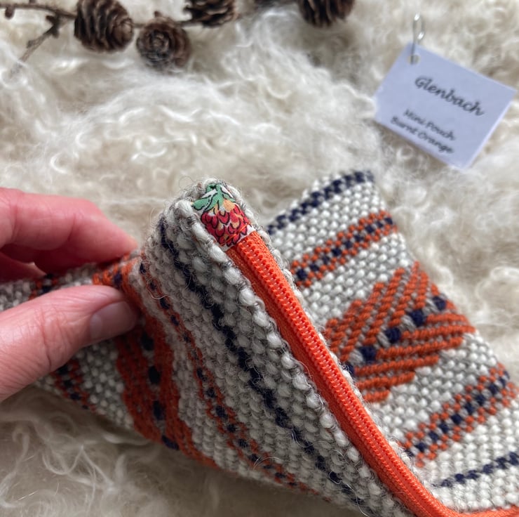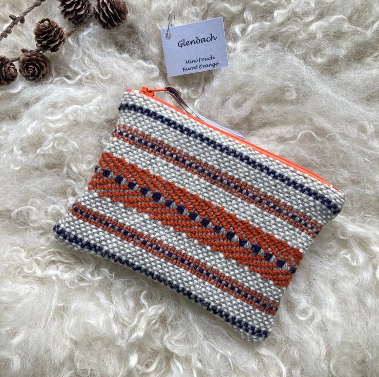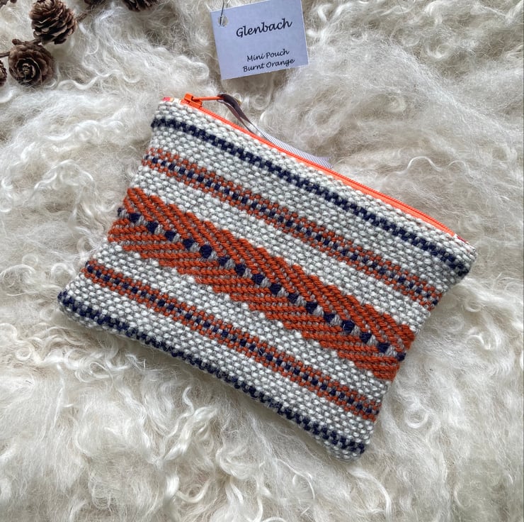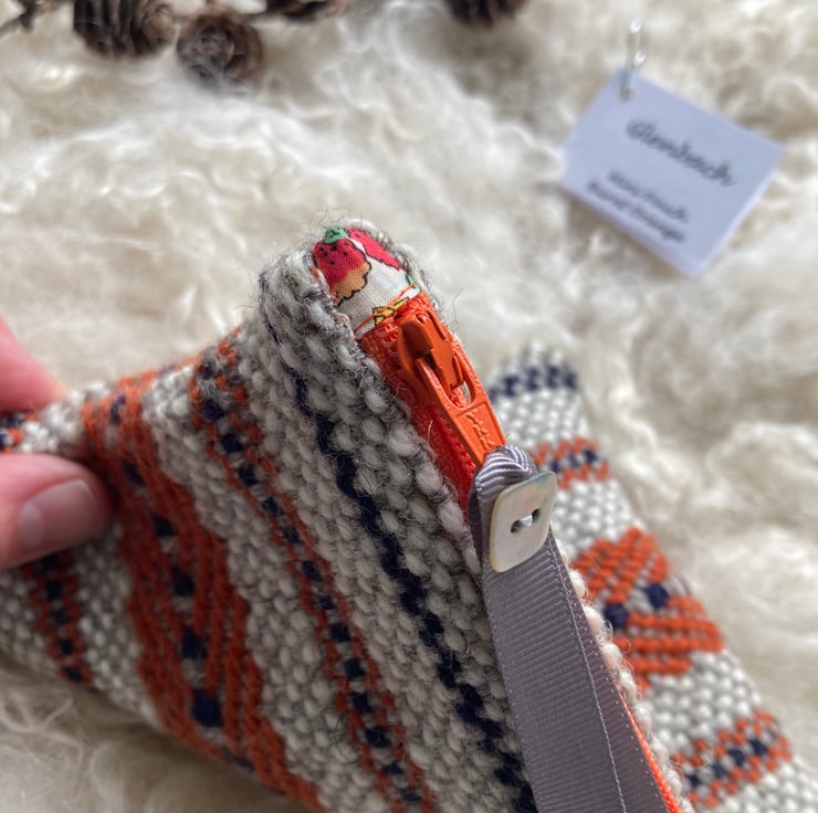 Our Mini Pouch is handwoven using natural shades of grey and ecru wool with a contrast of burnt orange and navy - all British wool.