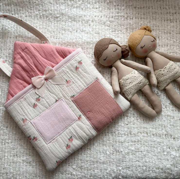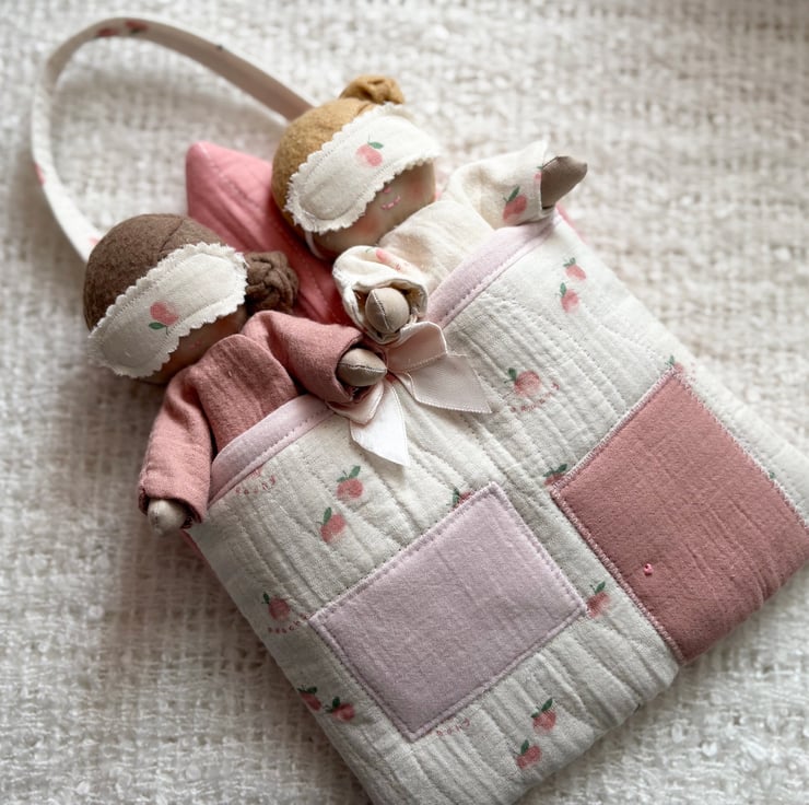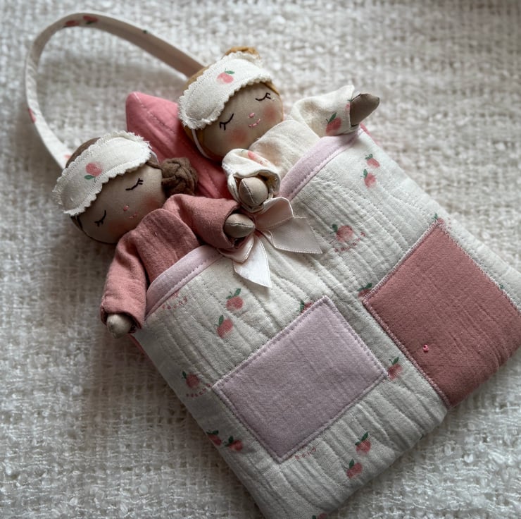 Handmade quilted dolls house bag with mini rag dolls and outfits