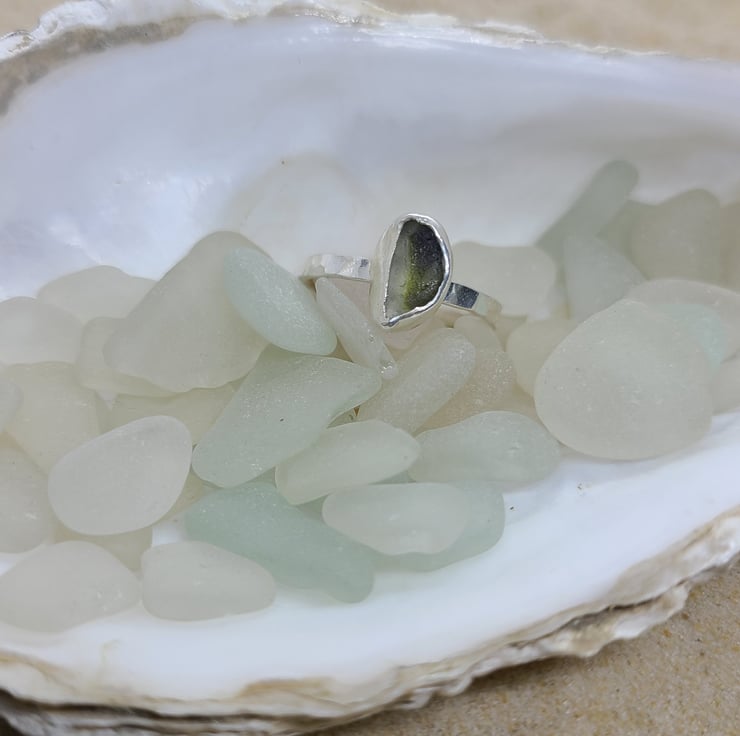 A piece of genuine UK sea glass (Green multi) set in fine silver on a sterling silver hammered band.