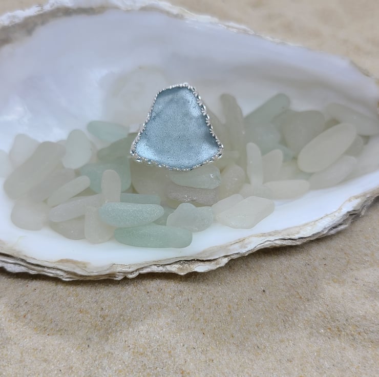 A piece of genuine UK sea glass (Pale ice blue) set in fine silver on a sterling silver hammered band.