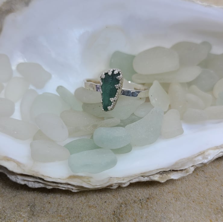 A piece of genuine UK sea glass (Jade green) set in fine silver on a sterling silver hammered band.