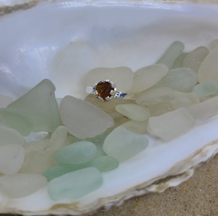 A piece of genuine UK sea glass (Amber) set in fine silver on a sterling silver hammered band.