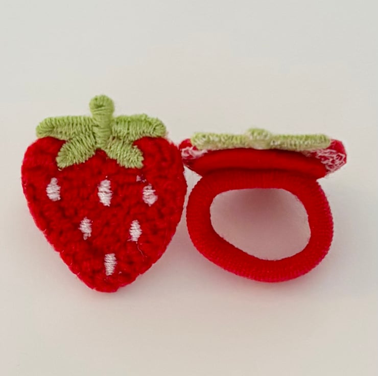 Handmade embroidered strawberries set on Red mini bands for a soft comfortable hold.