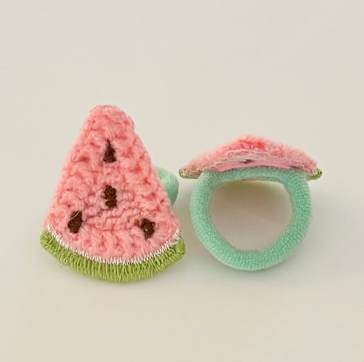Handmade embroidered watermelon set on green mini bands for a soft comfortable hold.