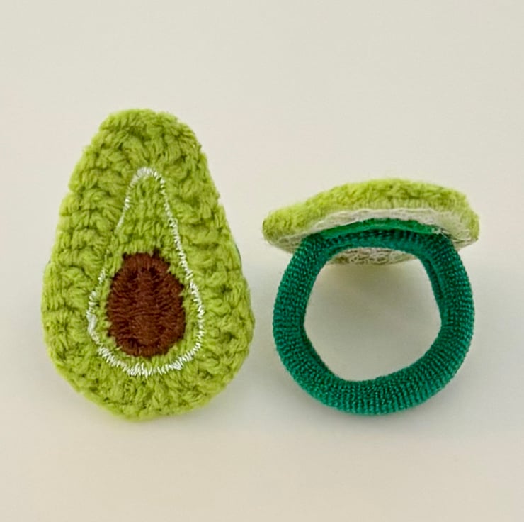 Handmade embroidered avocado set on green mini bands for a soft comfortable hold.