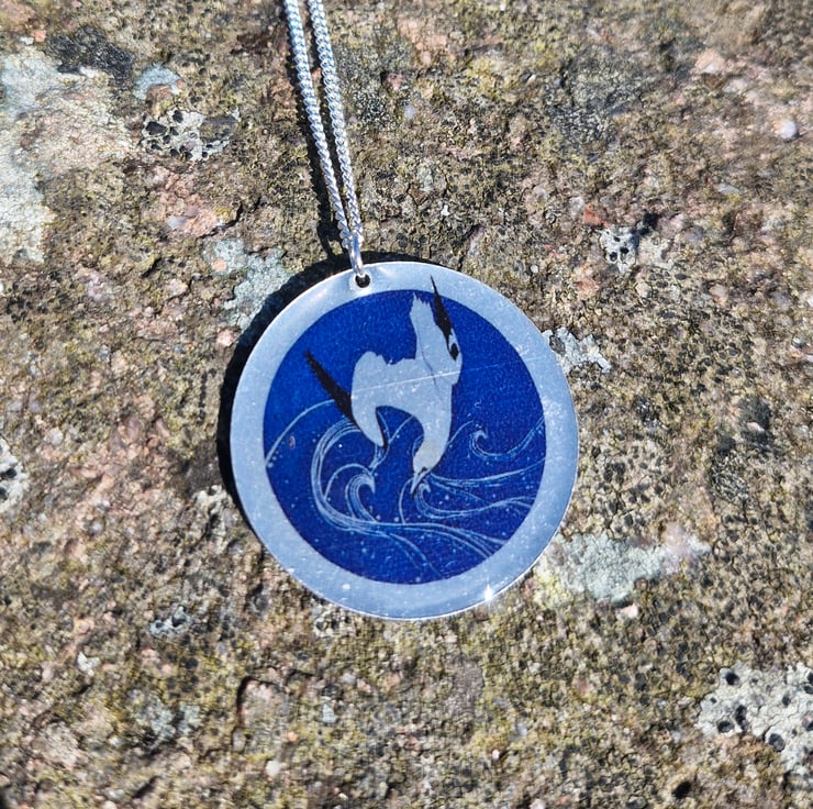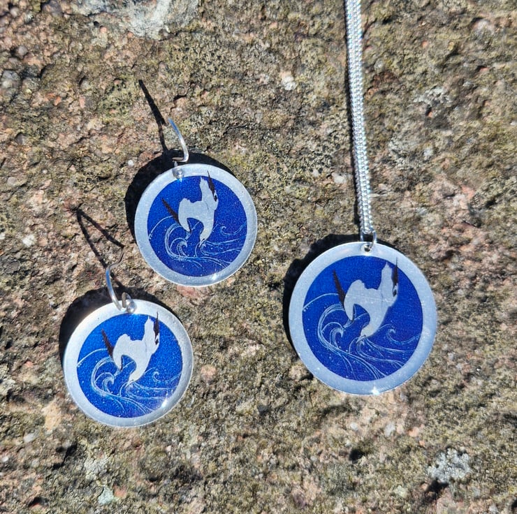 Aluminium and Sterling Silver pendant, approximately 31mm in diameter. The disc is made from aluminium and has had a print of an original artwork by Hannah MacIver transferred on to it, and then sealed in UV resin. Sterling silver ear chain.