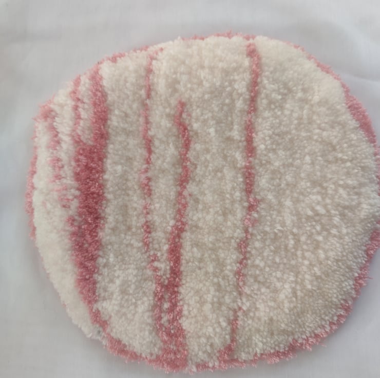 Made using a tufting gun, this one-of-a-kind piece features plush acrylic yarn on monks cloth, backed with strong liquid latex for durability and grip. Its gentle curves and soft striped design add a cozy, handmade charm to any bedroom, reading nook, or quiet corner.