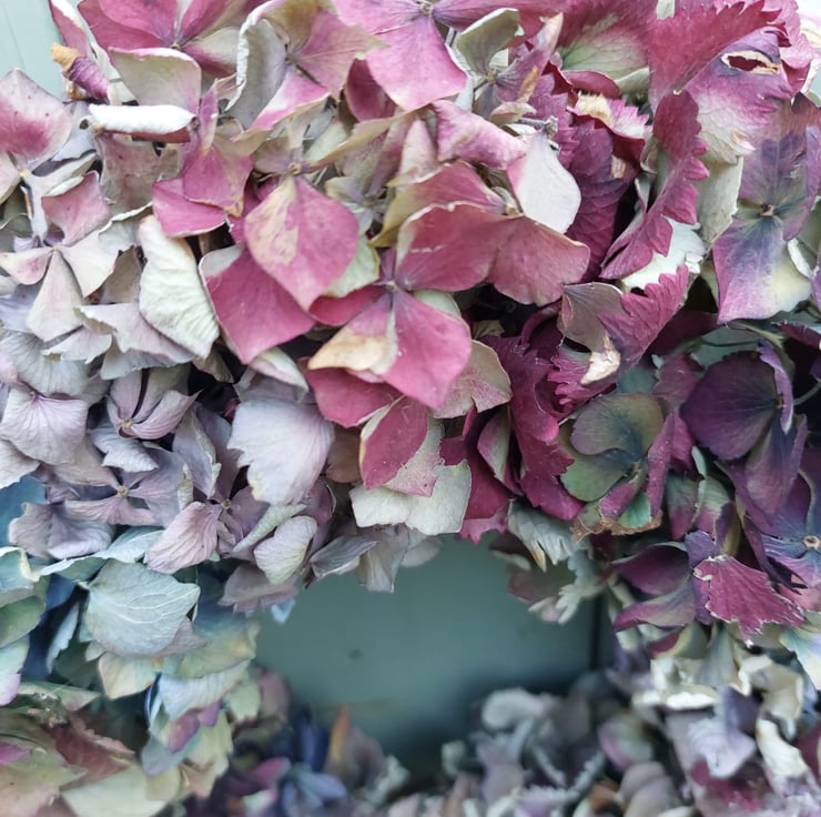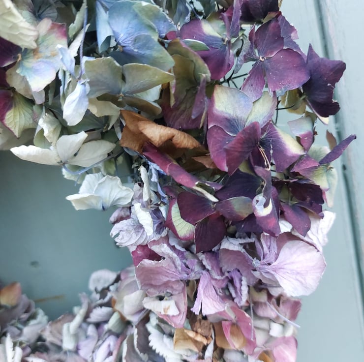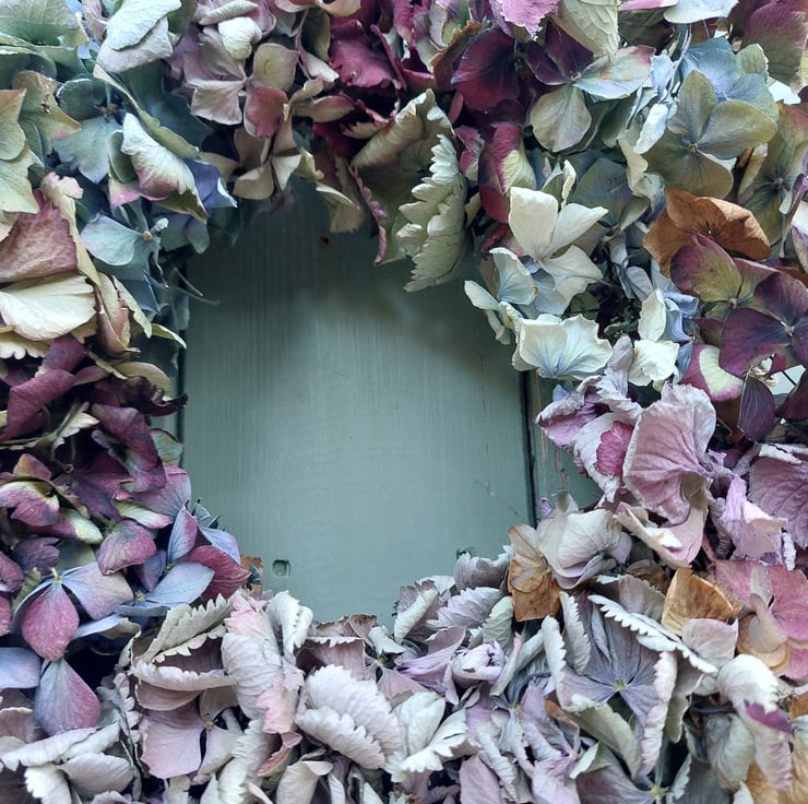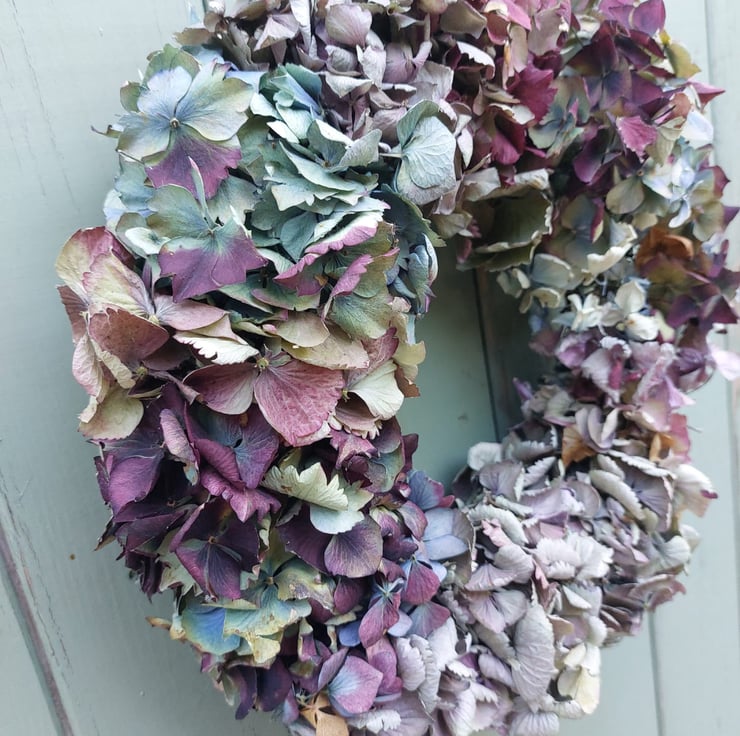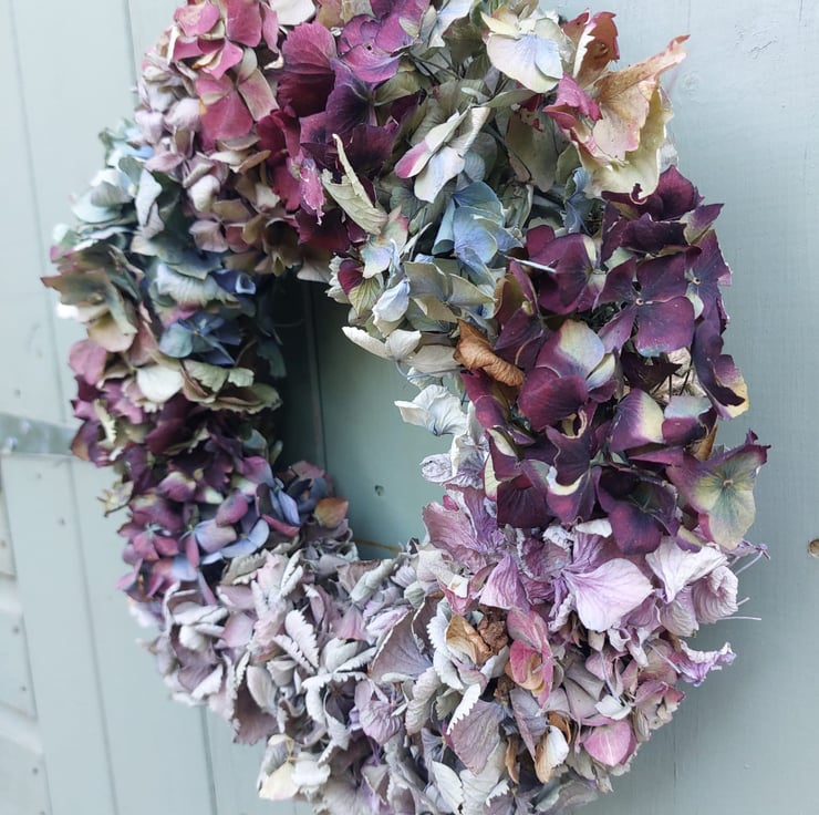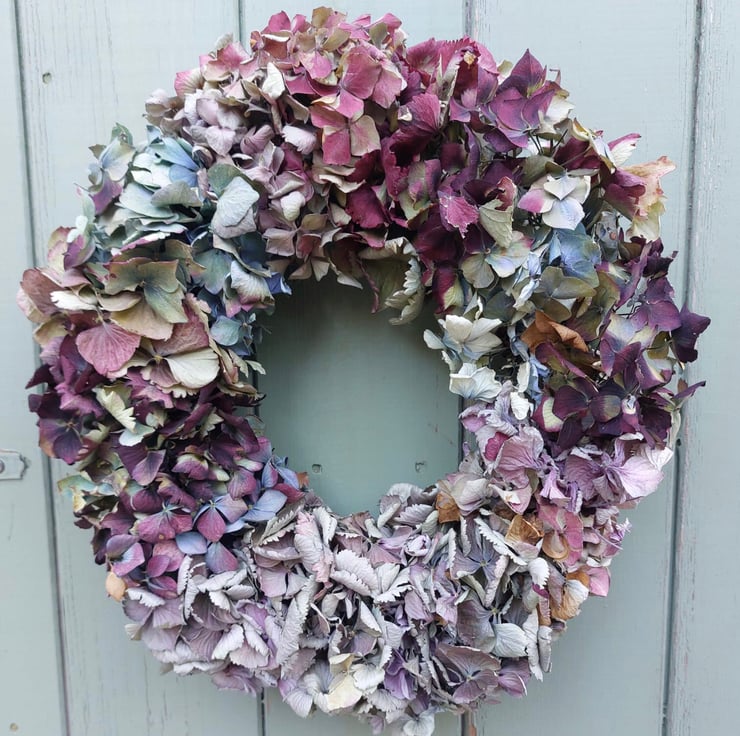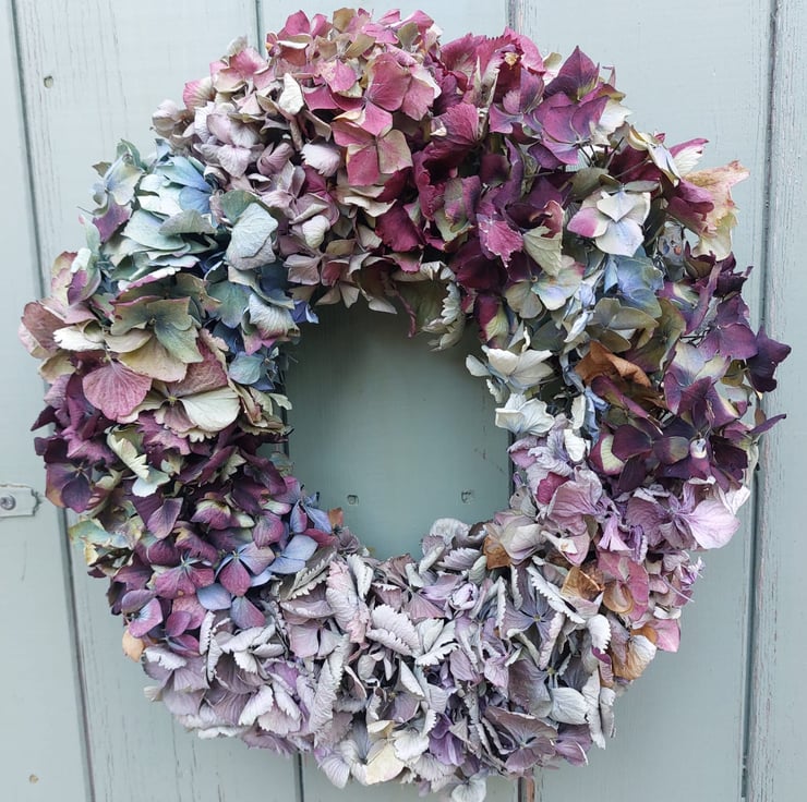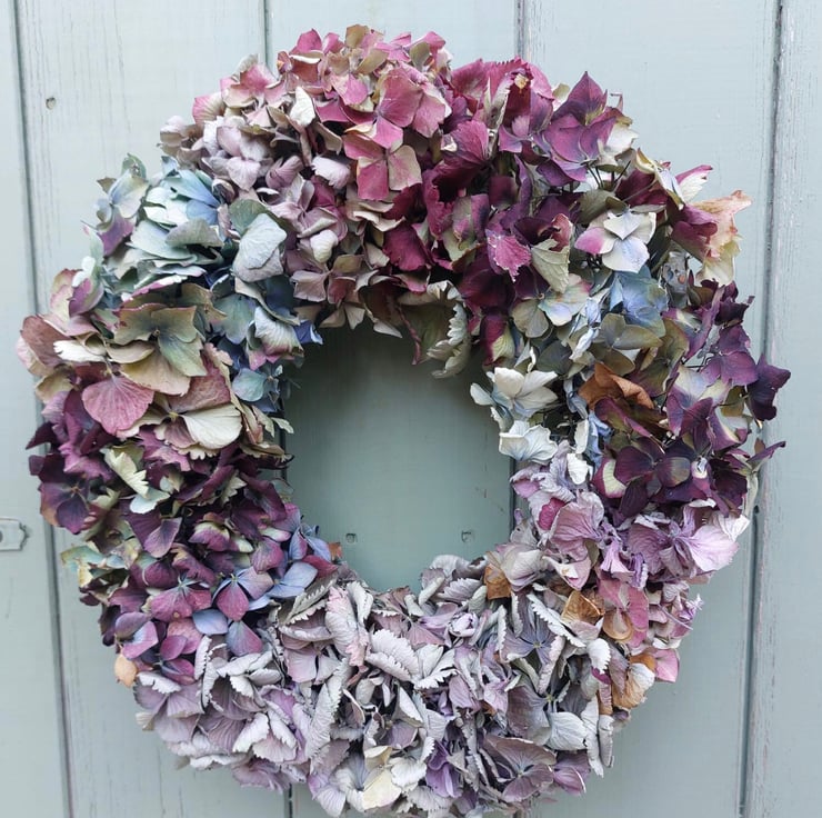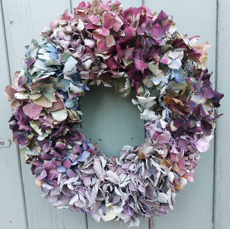 A handmade dried hydrangea wreath measuring approximately 30cm in diameter in muted shades.