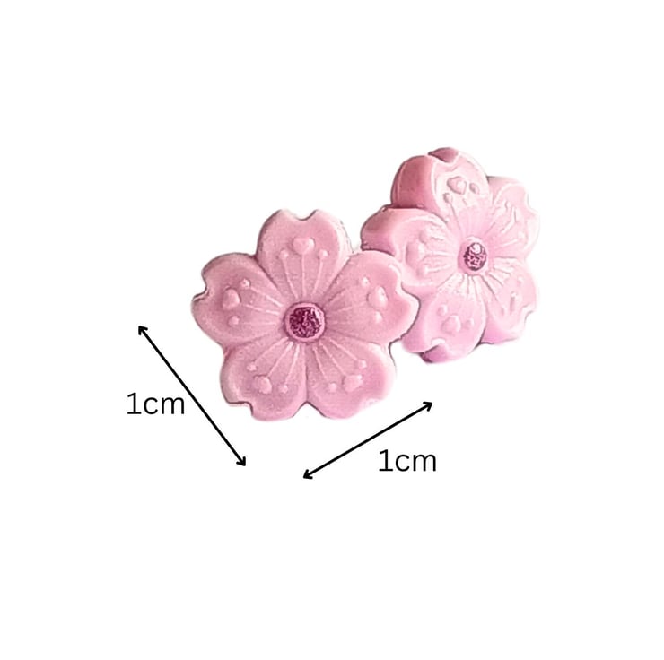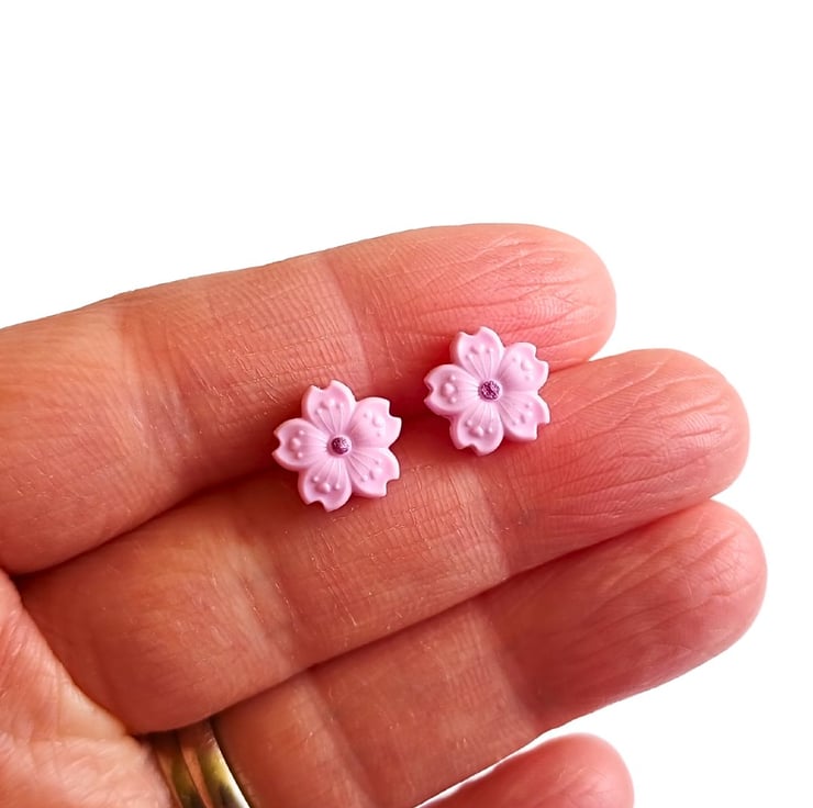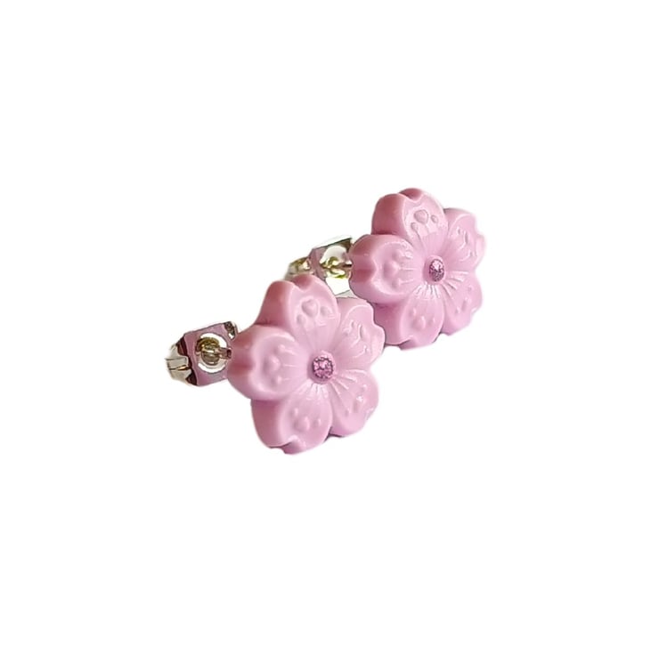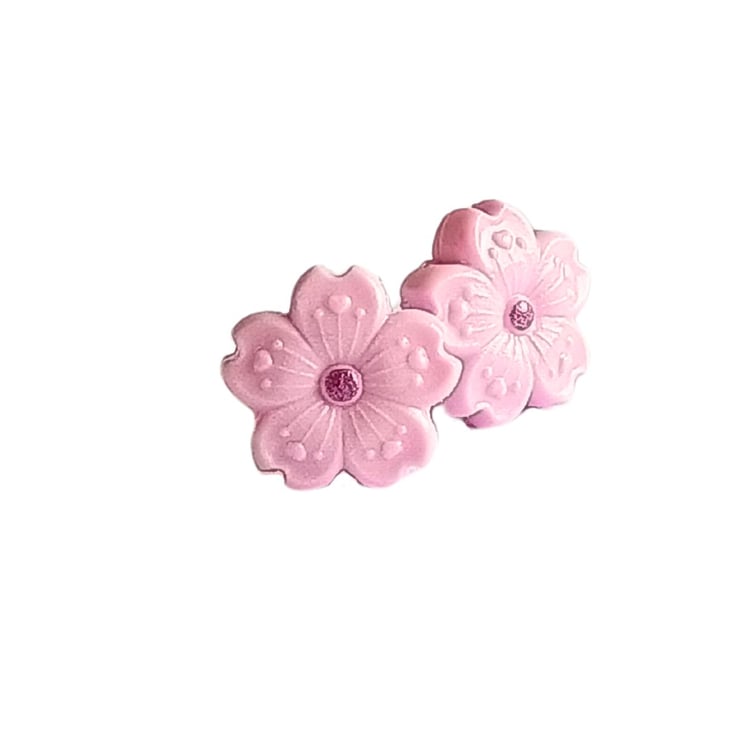 A pair of pink cherry blossom stud earrings. These earrings have been handmade from polymer clay and feature subtle embossed texture in the petals with a dark metallic pink centre.
