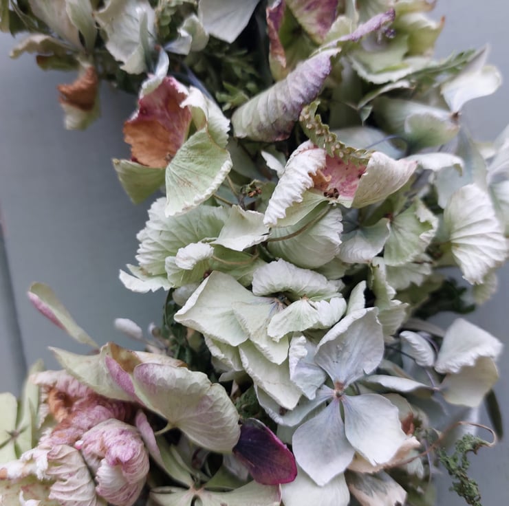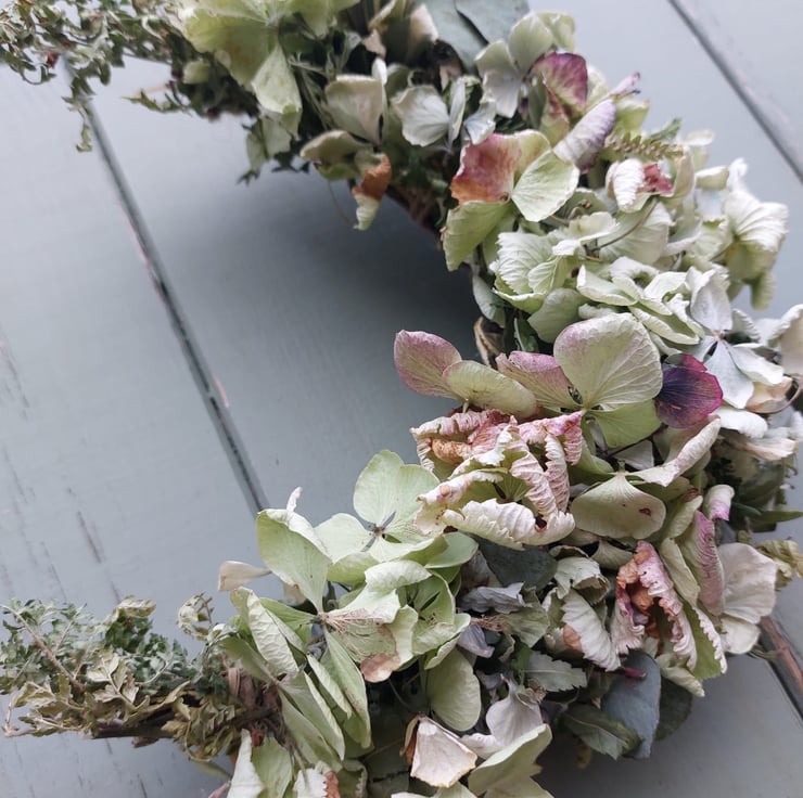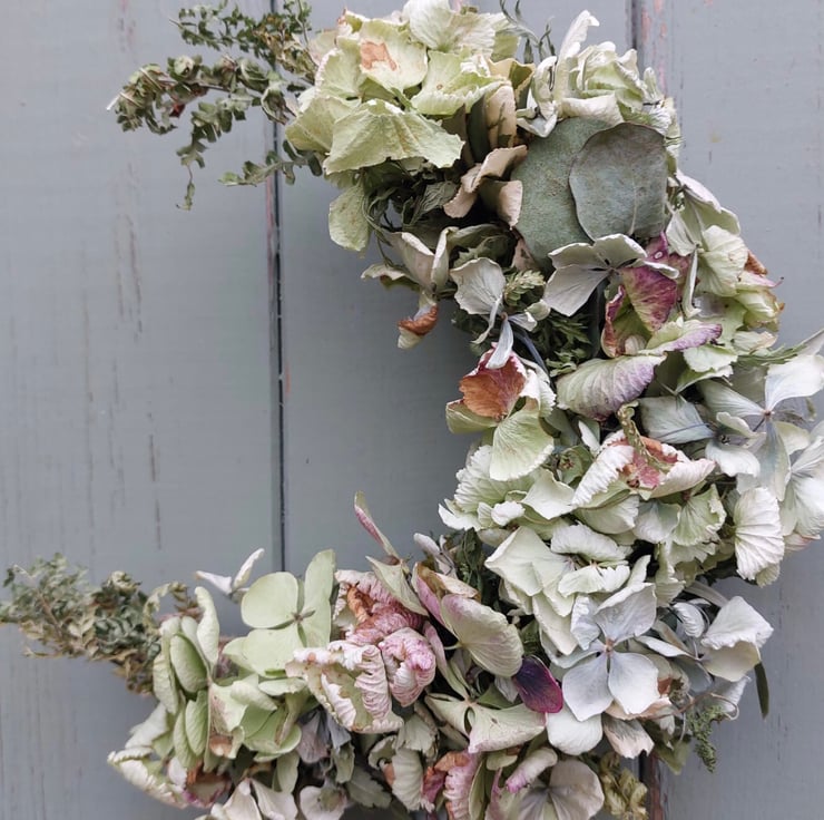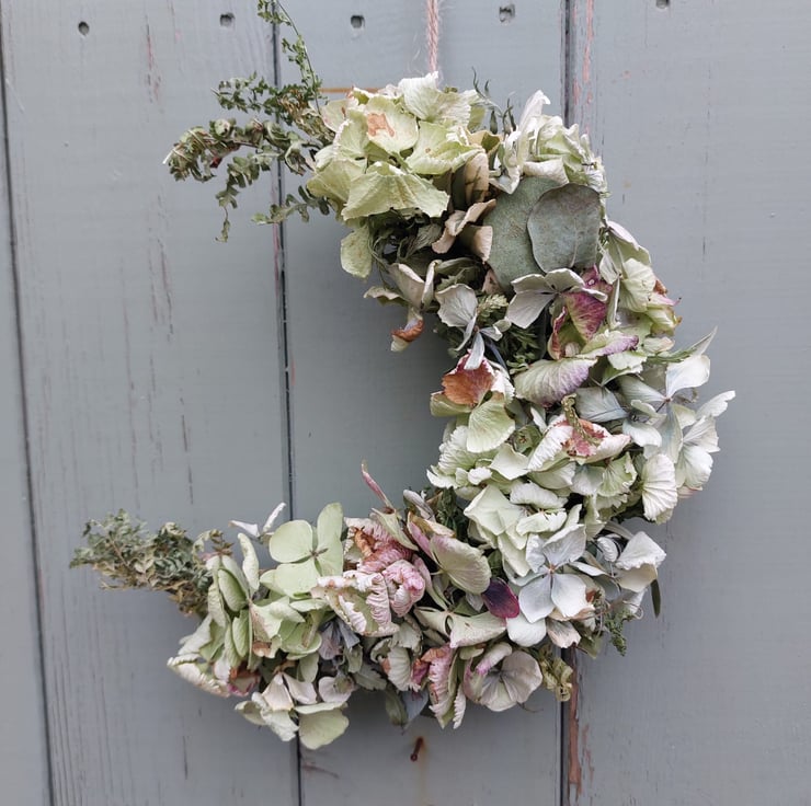A handmade dried hydrangea crescent moon shape wreath measuring approximately 24cm tall in shades of pale green.