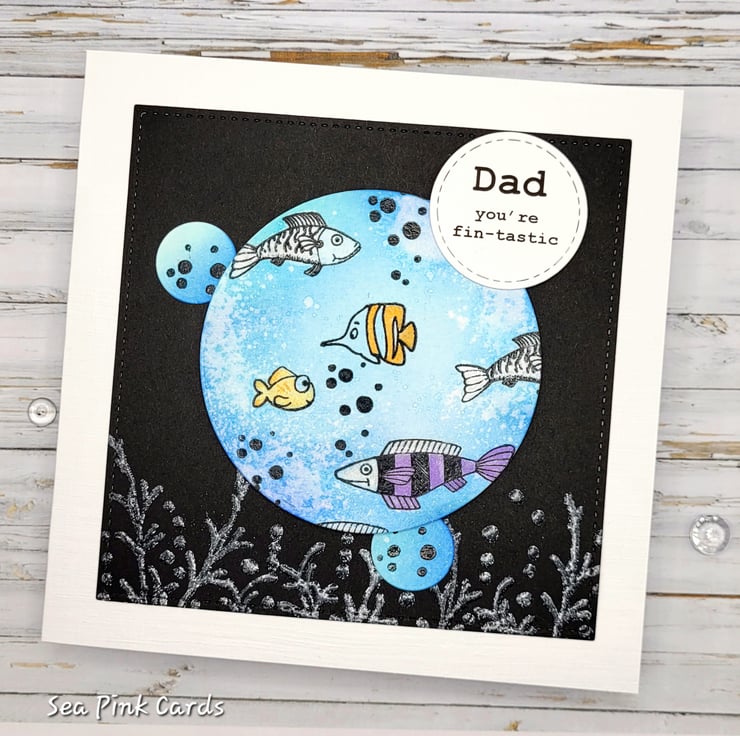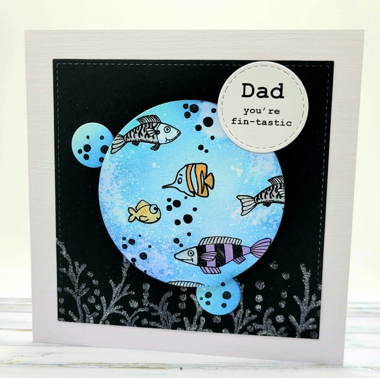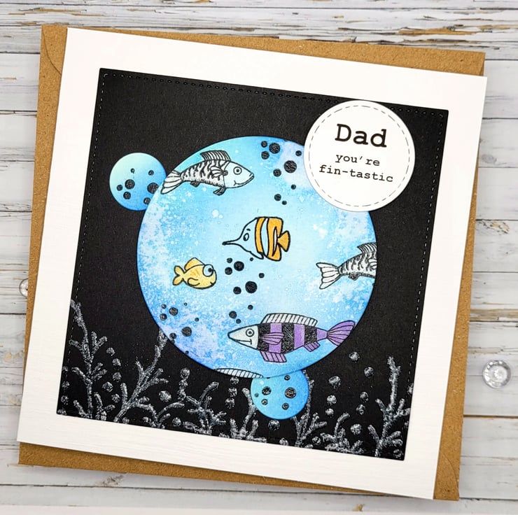 An individually handmade greetings card for Dad, with a funny design of fish, bobbing along in a sea of bubbles and kelp!. There is also a 'punny' sentiment, Dad you're fin-tastic! This individually designed and handcrafted card is 14.5 x 14.5 cms and has a layered style, with texture and non-bulky 3D dimension. Supplied with a 100% recycled brown kraft paper envelope. This unique card for Dad was created for either father's day or a birthday.