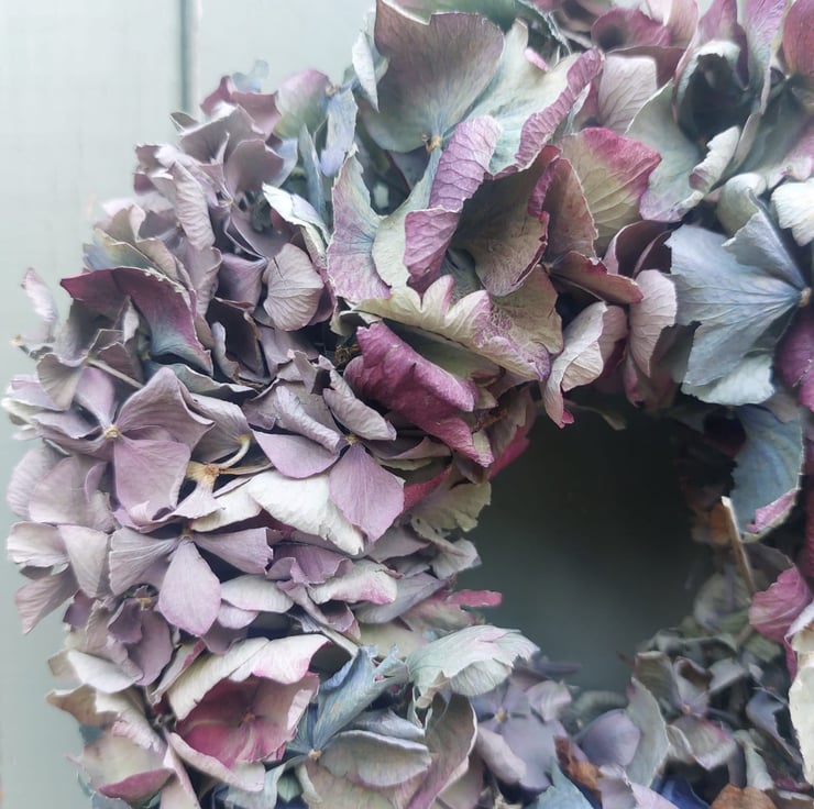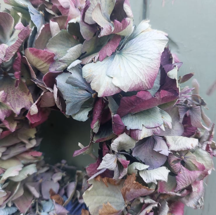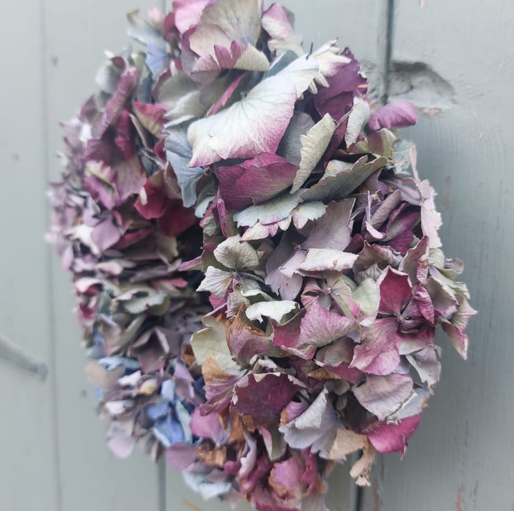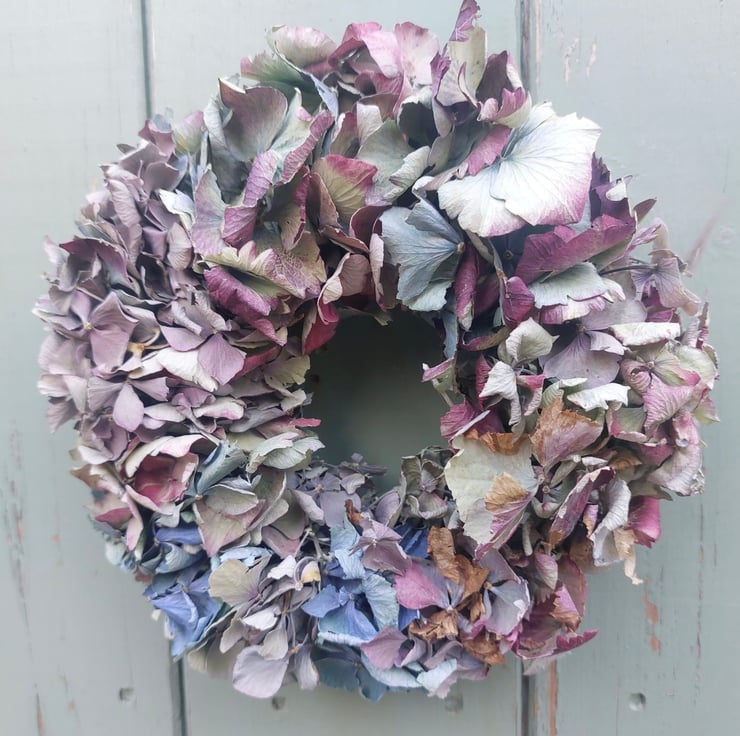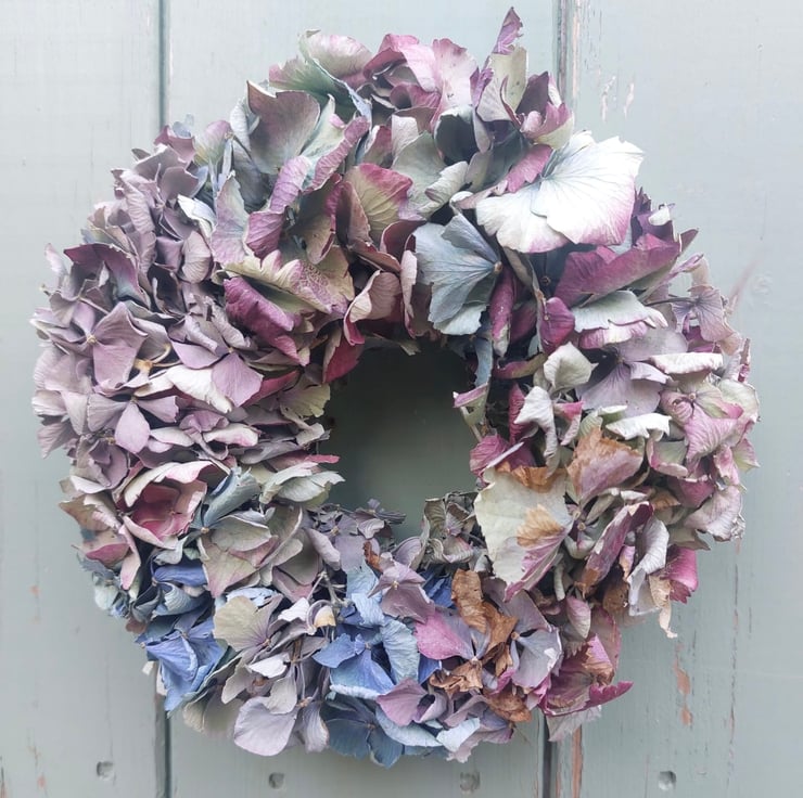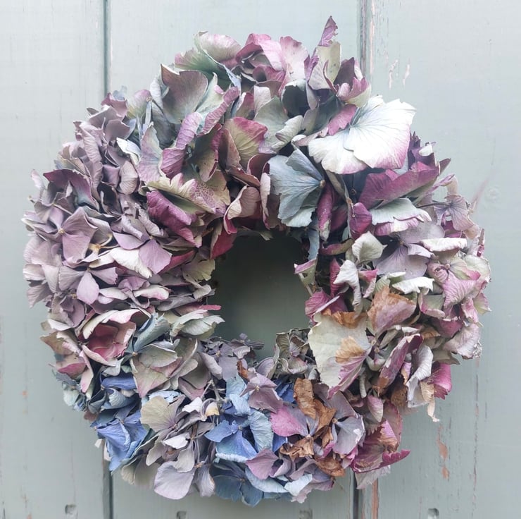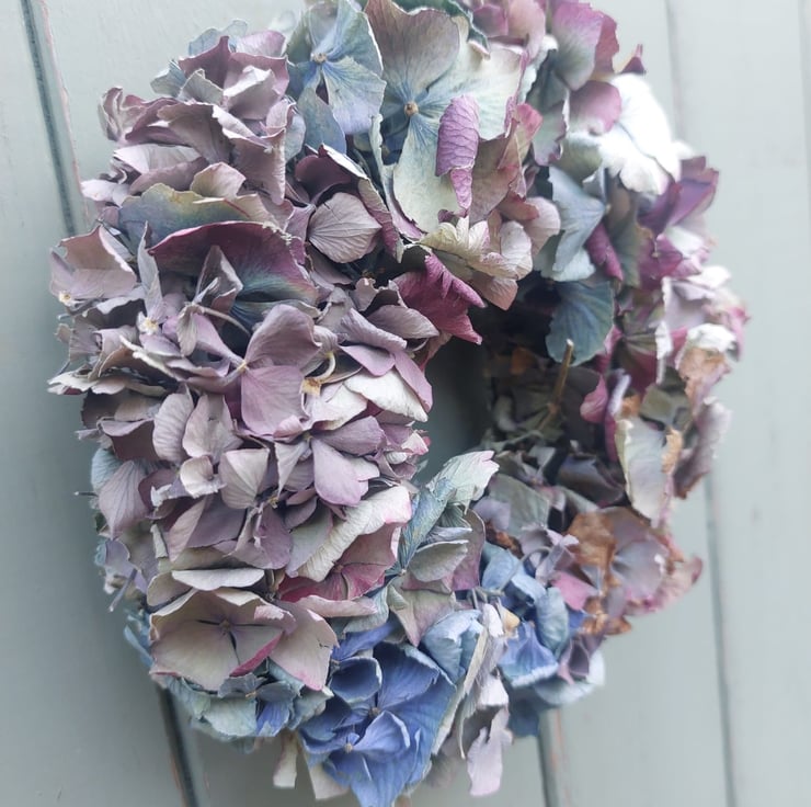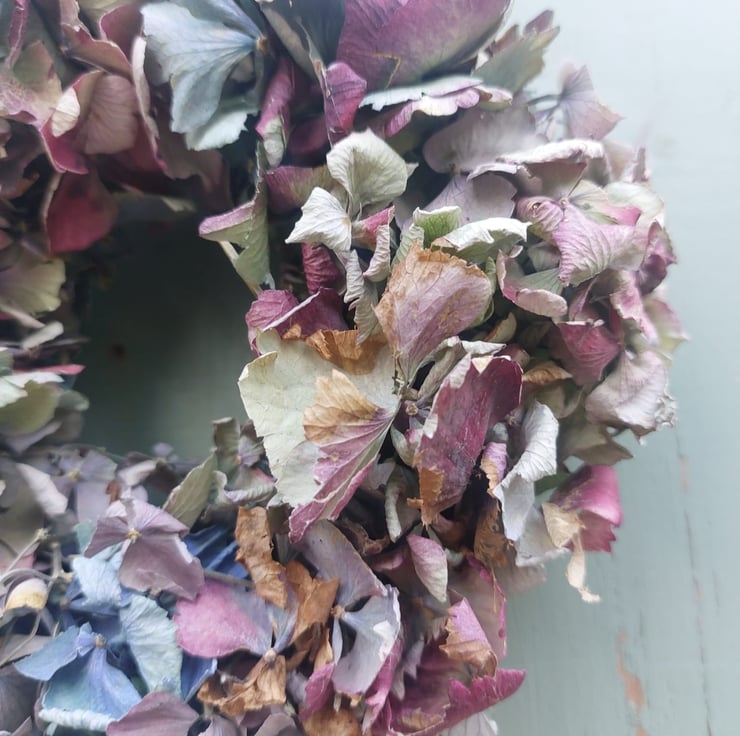 A handmade dried hydrangea wreath measuring approximately 17cm in diameter in shades of purple, blue, green and red.