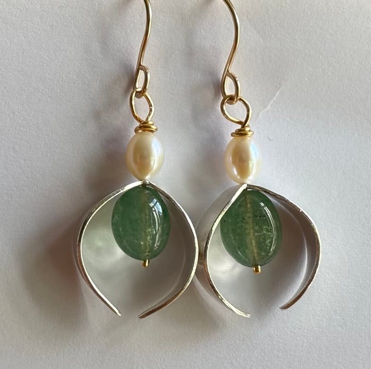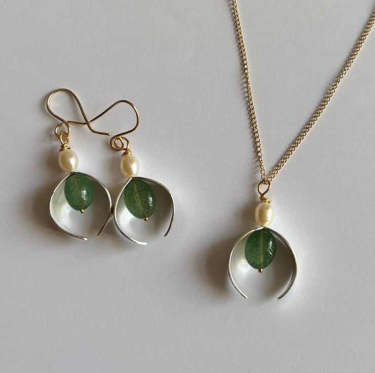 Handmade jewellery set featuring sterling silver leaf curve, freshwater pearl and green strawberry quartz beads.Finished with rolled gold filled accents this set includes matching earrings and a necklace perfect for adding a natural graceful touch to any look.