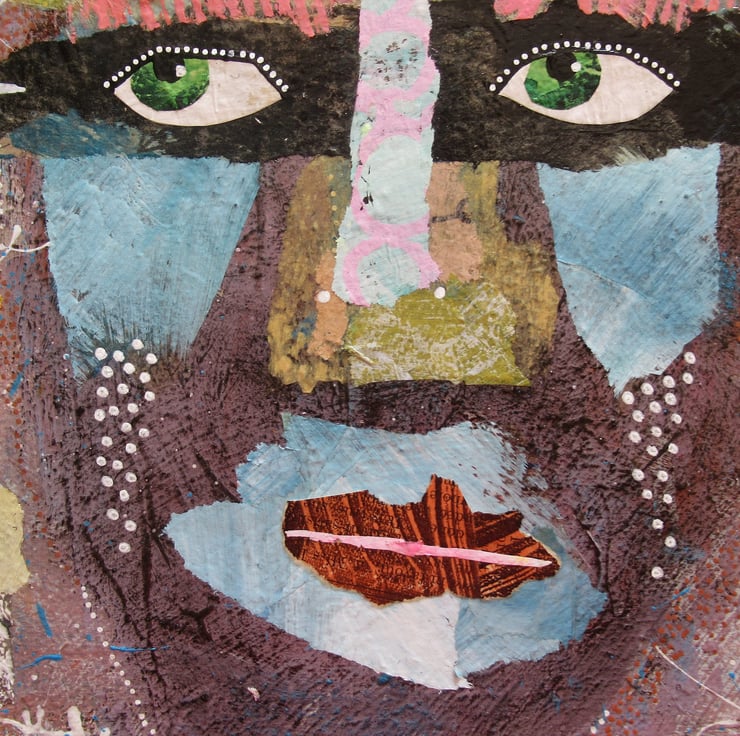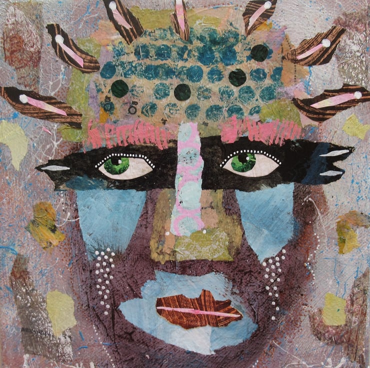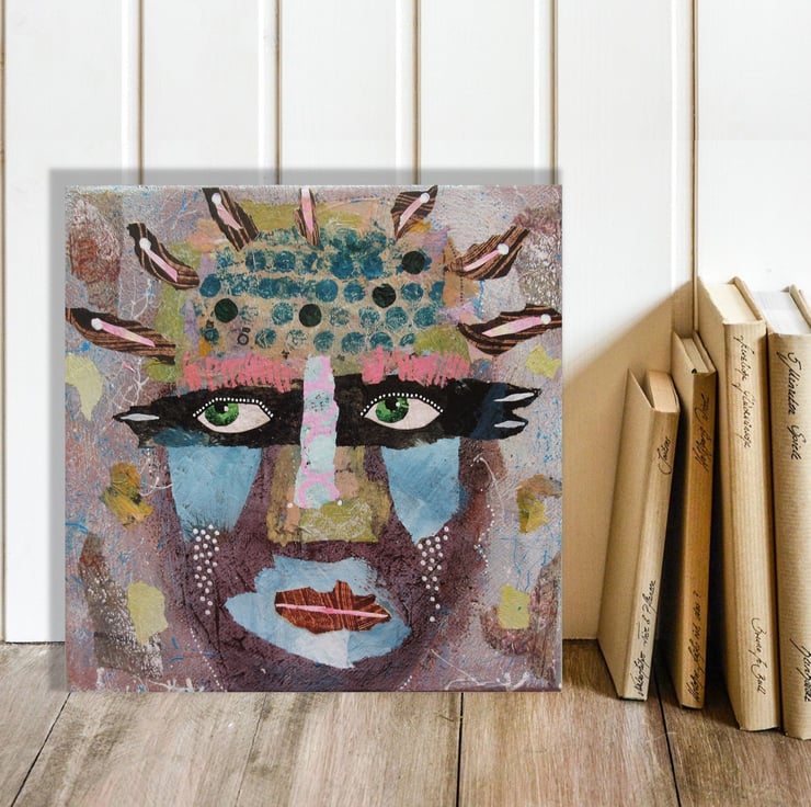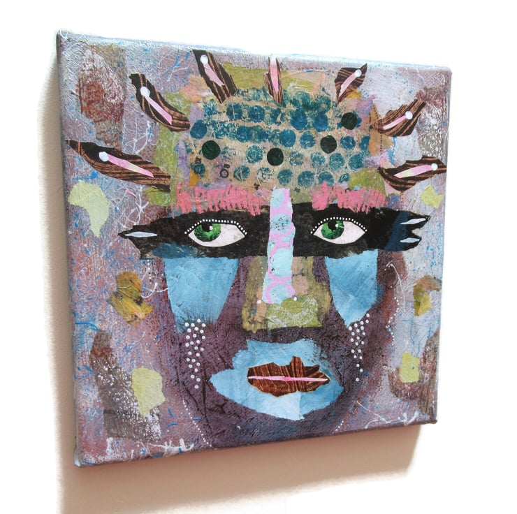 Small yet striking, abstract face / portrait painting in acrylic and collage with surface texture on 8 x 8 inch stretched canvas. The 0.75 inch edges of the canvas are painted, so no frame is necessarily required. This unusual & attractive original which will fit beautifully on a small wall or in any bijoux interior. It is signed on the edge by Bea and has a soft sheen surface finish.