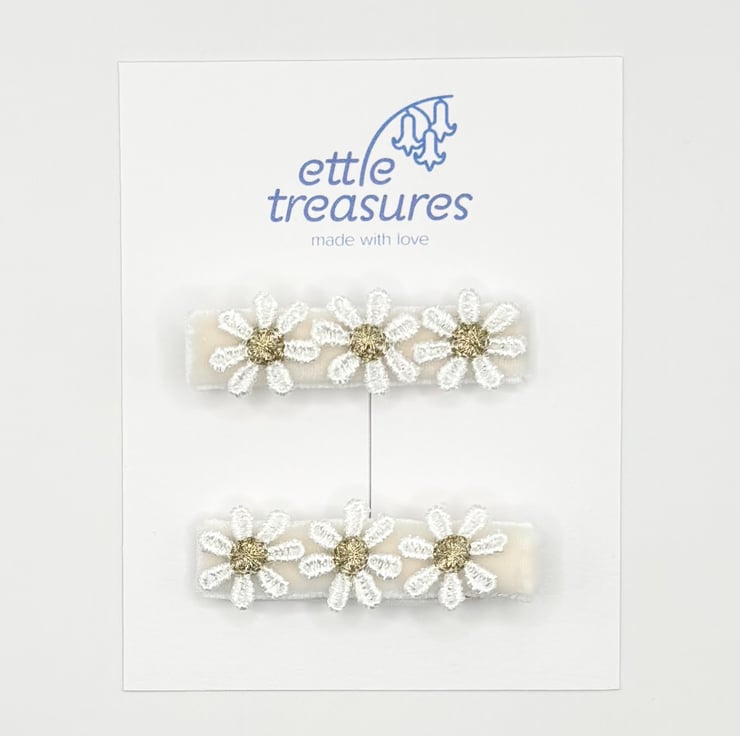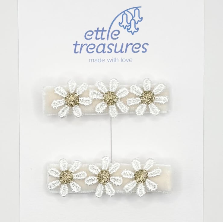 Handmade White velvet fully lined alligator hair clips with cotton sewn white and sparkly gold daisies, perfect summer vibe.
