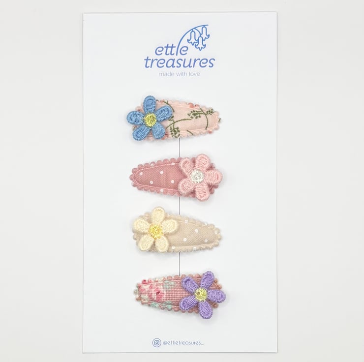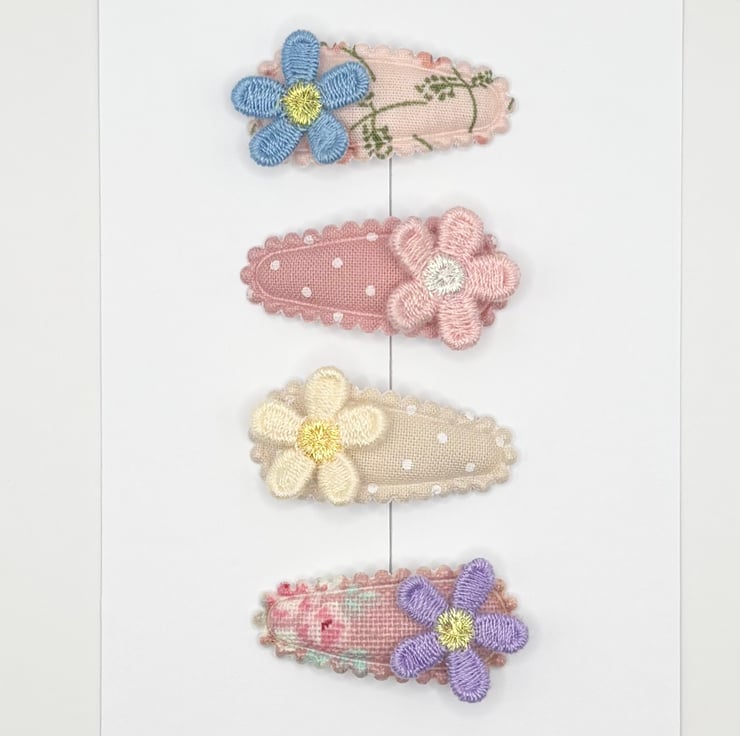 Mini baby size snap hair clips in a set of four. Cute selection of pattered and dotted fabric with cotton sewn daisies with sparkly middles. perfect summer vibe.