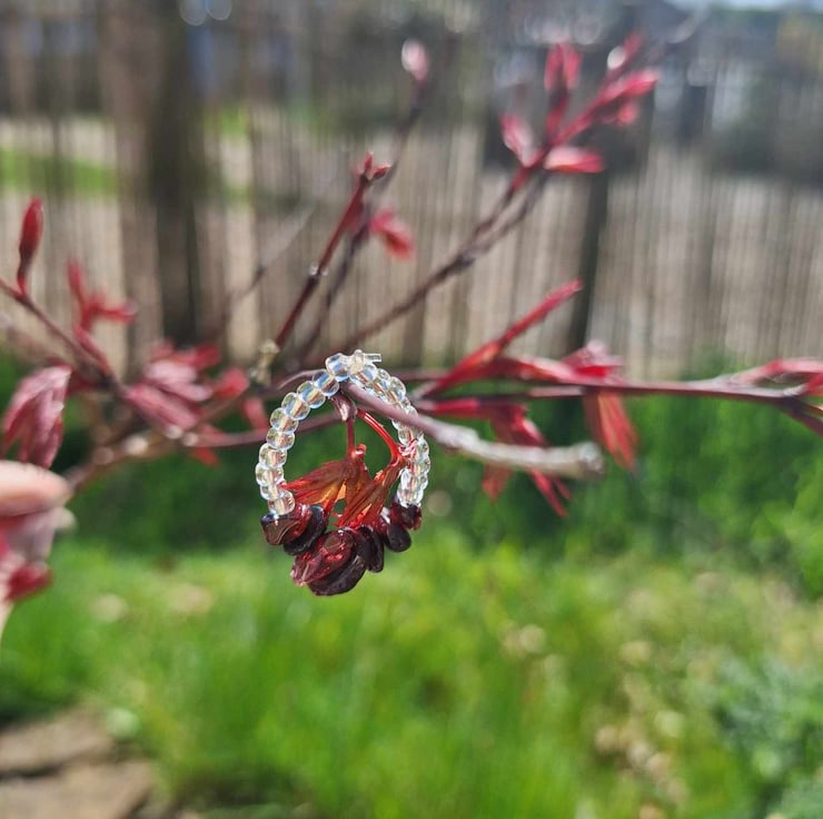 Sweet and simple, this ring is made from garnet chips and clear/silver seed beads for when your root is needing some love (or you just like the colour!)